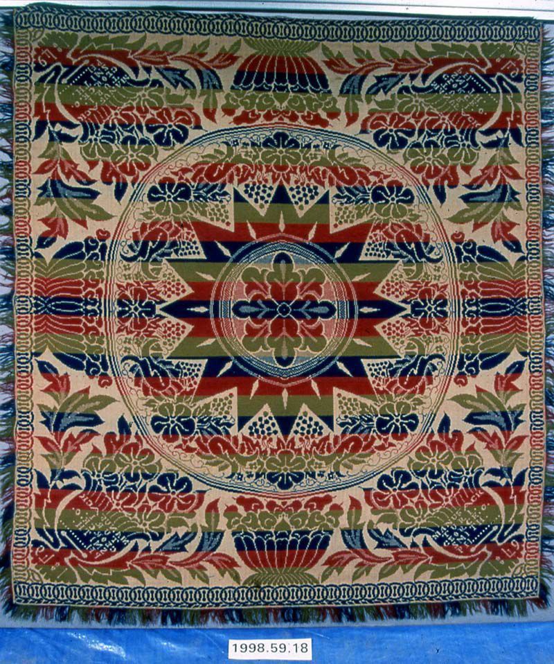 Figured coverlet; undyed cotton and red, blue, and olive wool, tied double cloth (Beiderwand). Top edge is hemmed, bottom and sides are fringed. Central motif is a large center medallion with a starburst design surrounding a center floral design. Each corner within the field has an urn of flowers with woven text. The center of the sides has a wide bowl, and the top and bottom center of the coverlet has a wide bowl filled with fruit. Border on all four sides has an interlocking circle motif.Collection