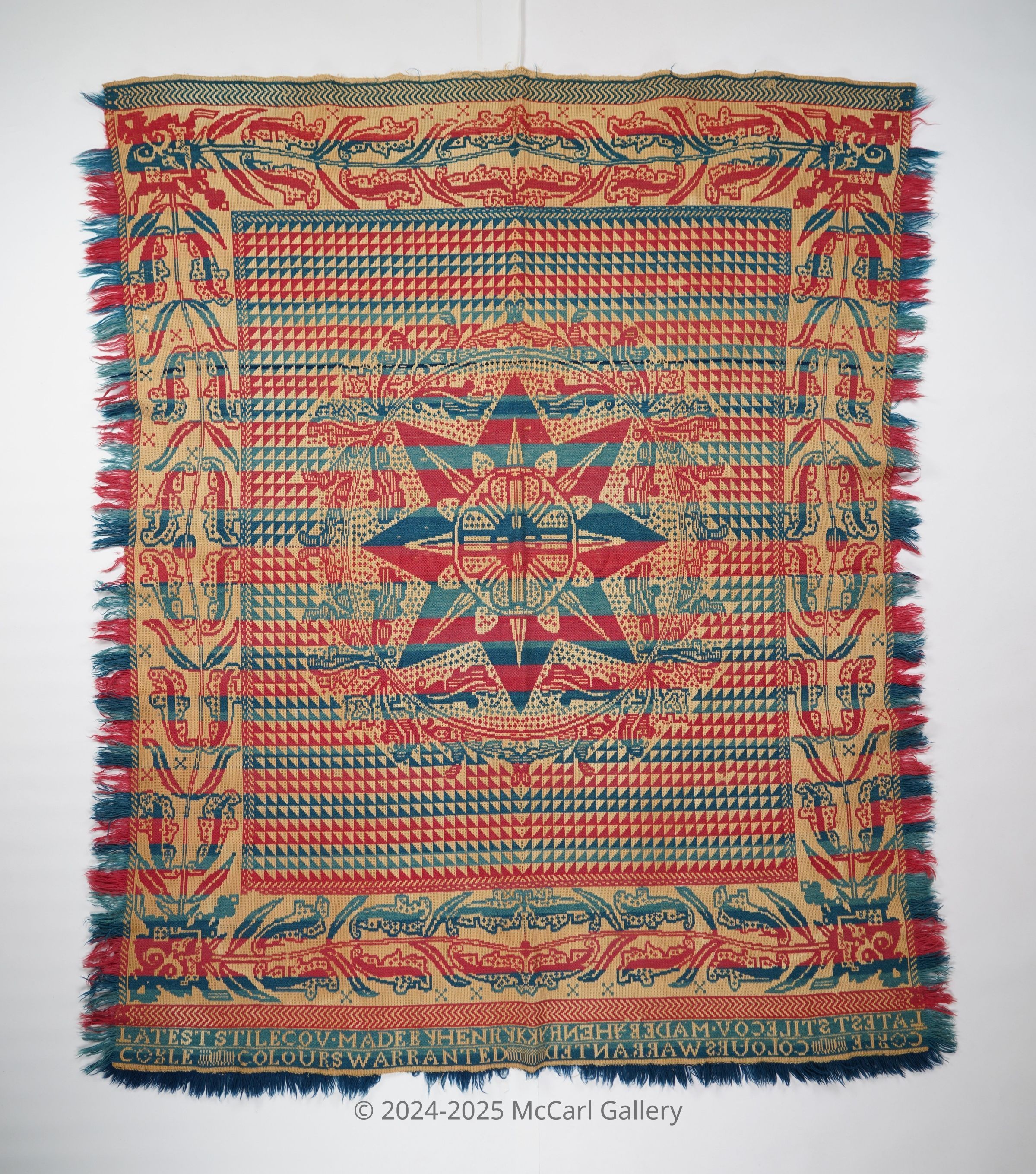 Red, blue, navy, and natural figured coverlet with border on four sides and fringe on three sides. Two joined panels. Woven by Henry Coble in Lancaster Co., Pennsylvania.Collection