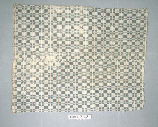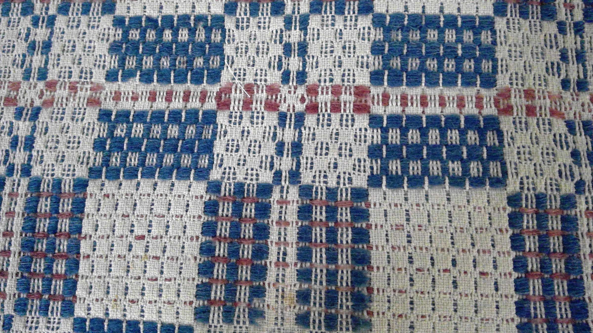 Coverlet, overshot, handwoven of natural cotton and blue and red wool. Has a center seam that is hand sewn and mismatched. Shows wear, some holes and torn spots, some stains. Note pinned to coverlet states "family heirloom- to go with Great Gdma's loom. Coverlet woven by Elizabeth Tennant Price circa 1870. Acq from Ruth Stephens Kelley 1977".