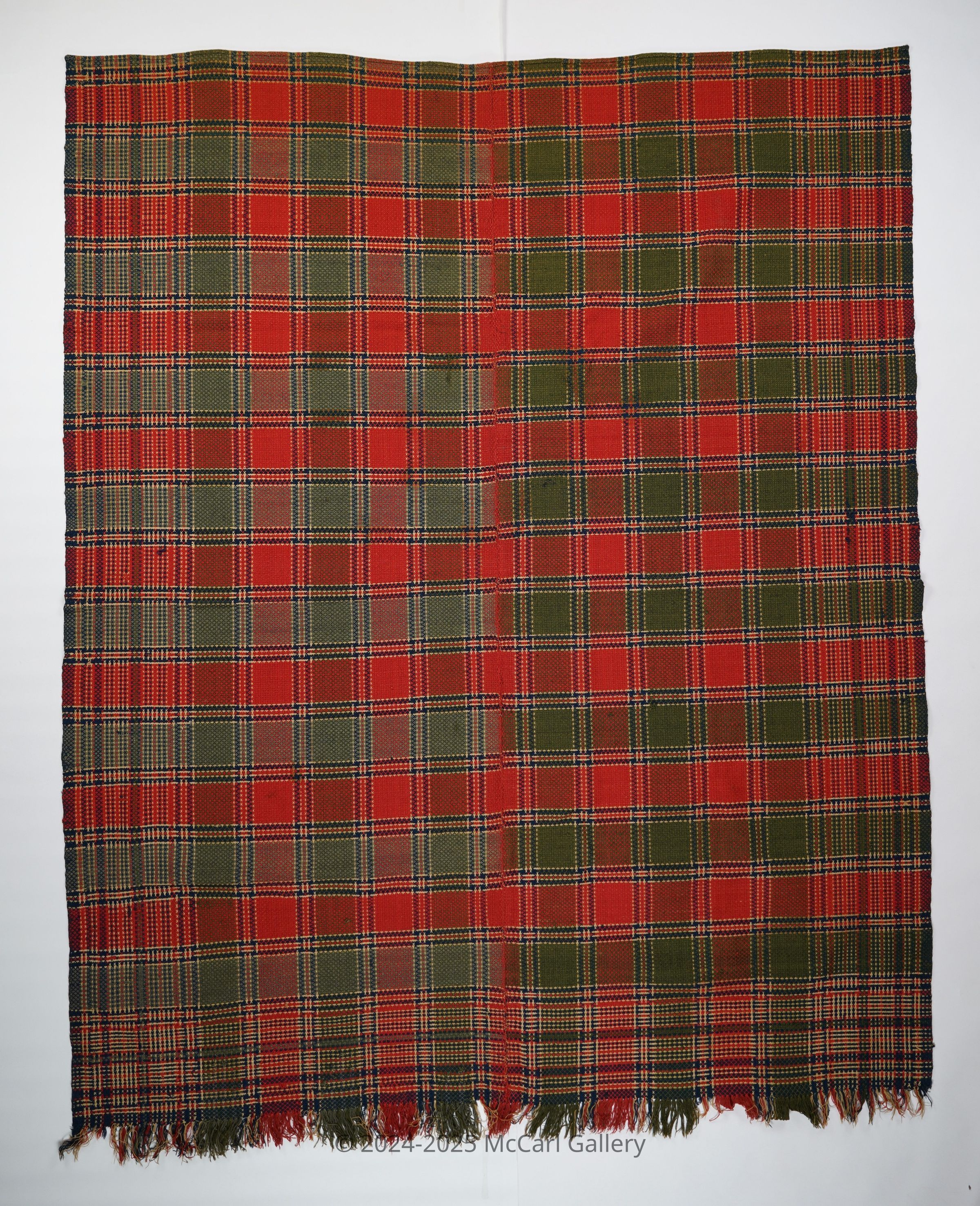 Red, navy, green, and natural geometric coverlet with border on three sides and self-fringe along bottom. Two joined panels.Collection