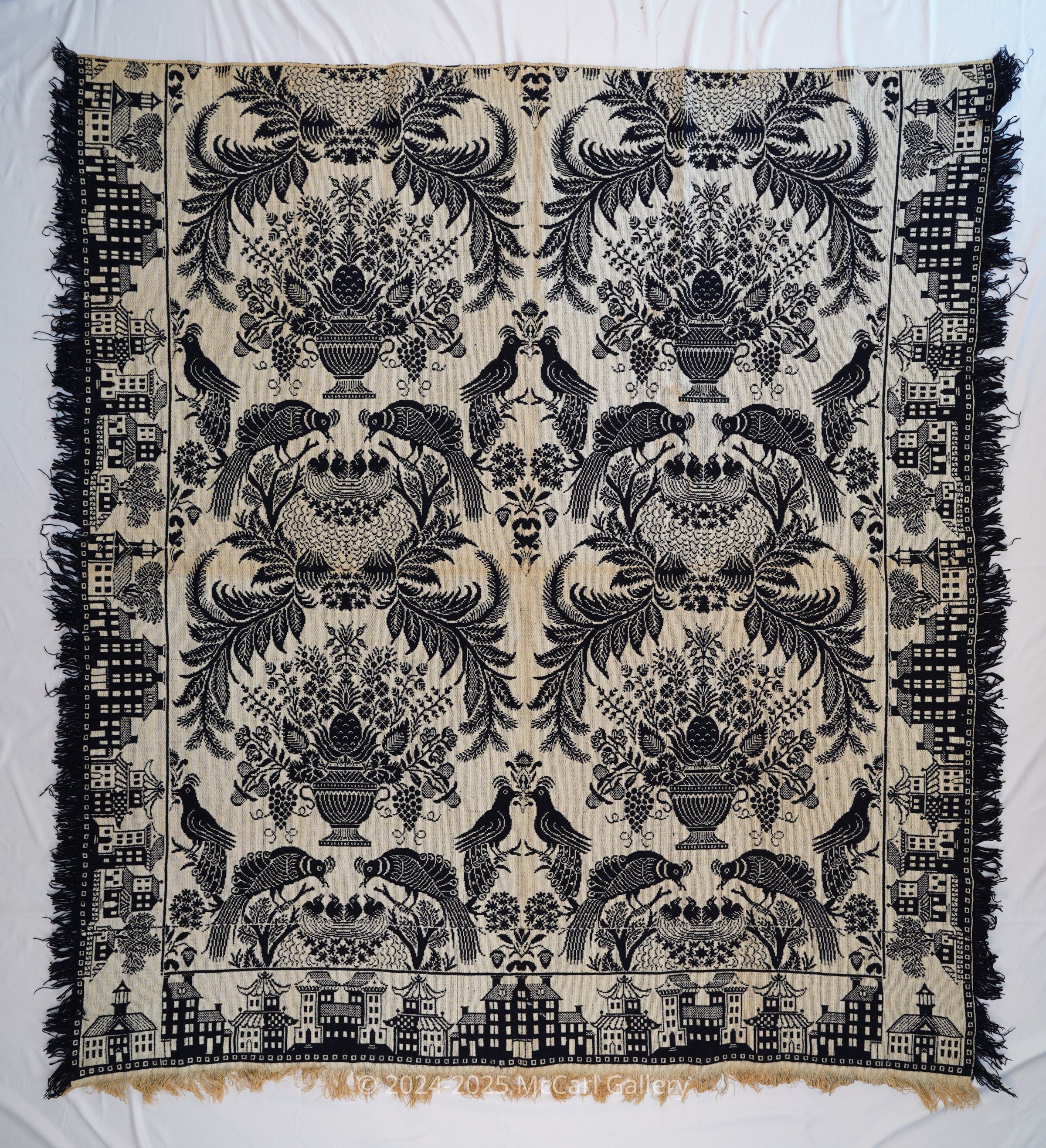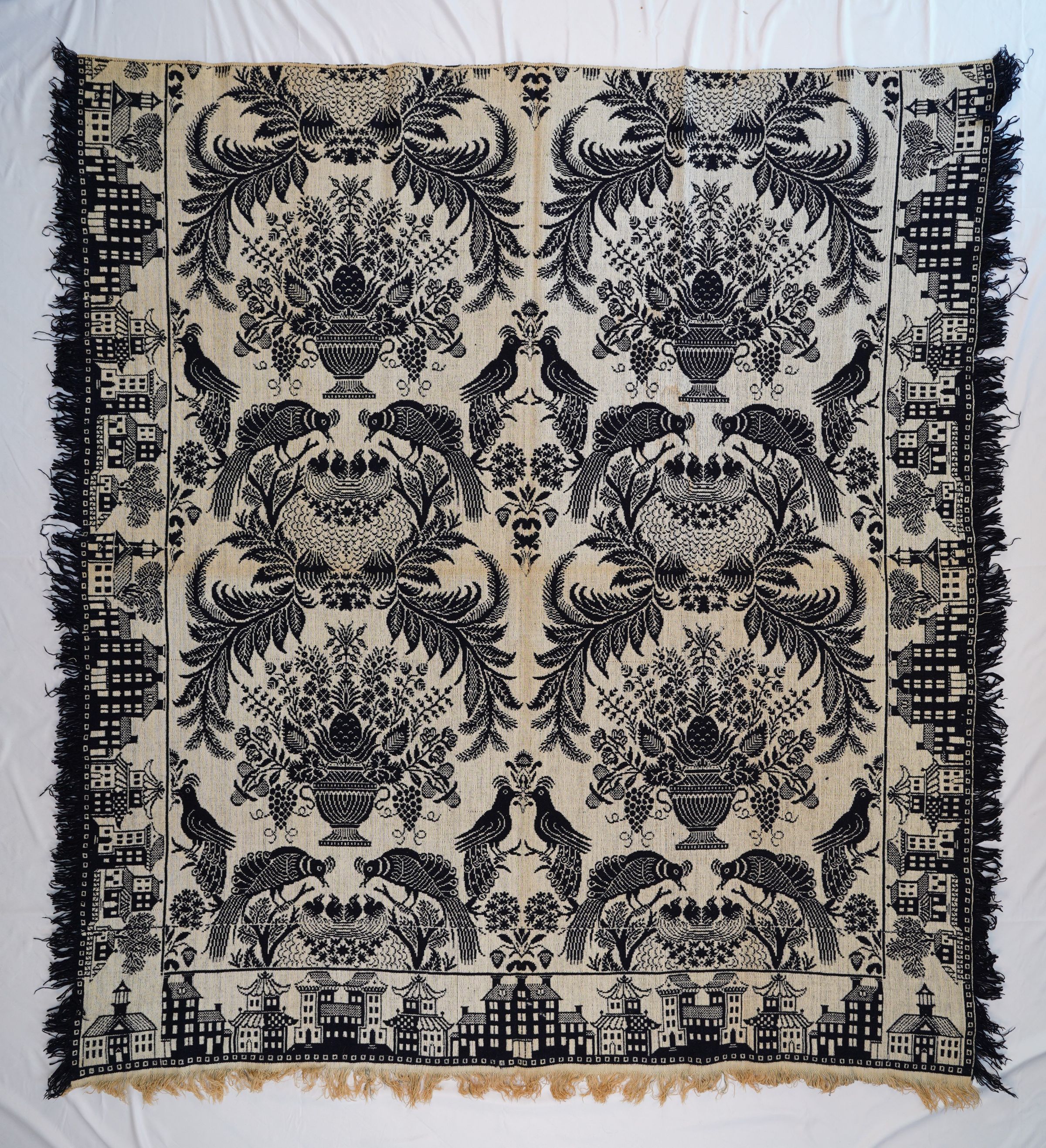 Navy and natural figured tied Beiderwand coverlet; seamless. Birds feeding young centerfield pattern, pagoda border on three sides, courthouse corner blocks. Self-fringe on three sides.Collection