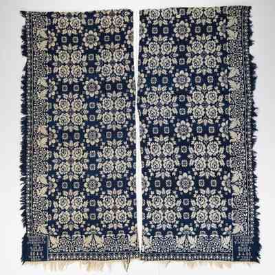 Navy blue and natural figured tied Beiderwand coverlet; grapevine borders and self-fringe on three sides. Woven by Henry O. Overholt for Sarah Freed.Collection