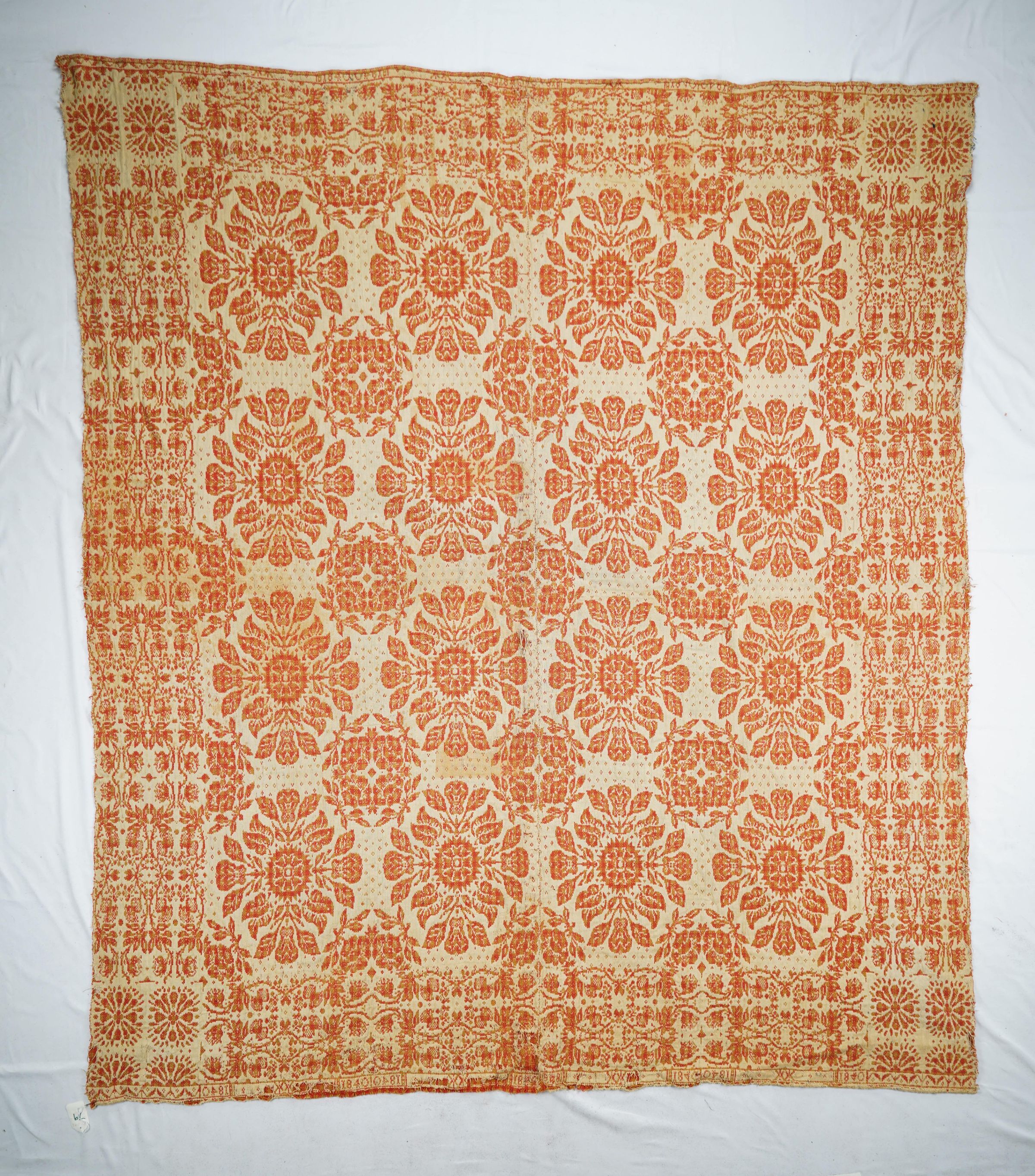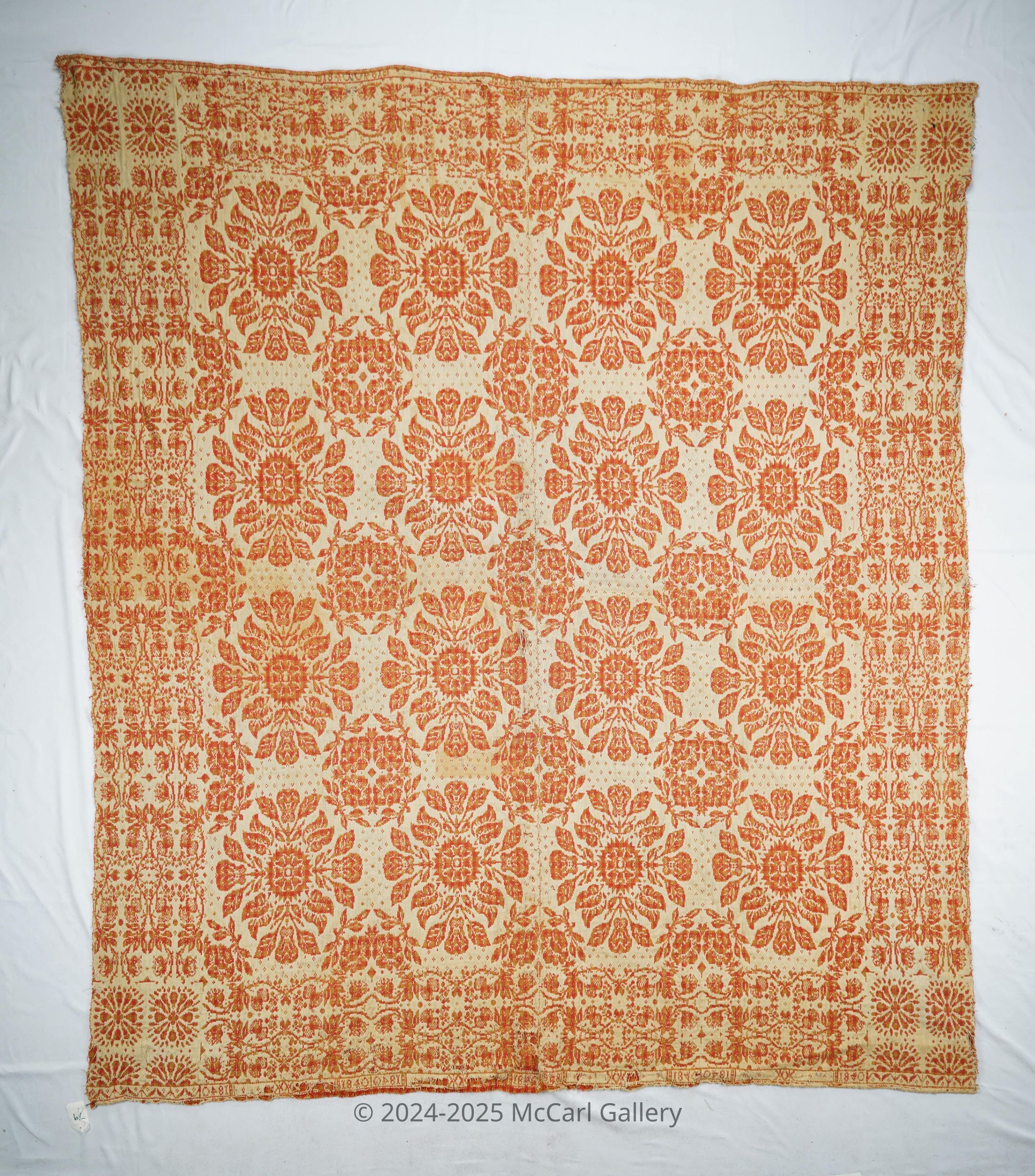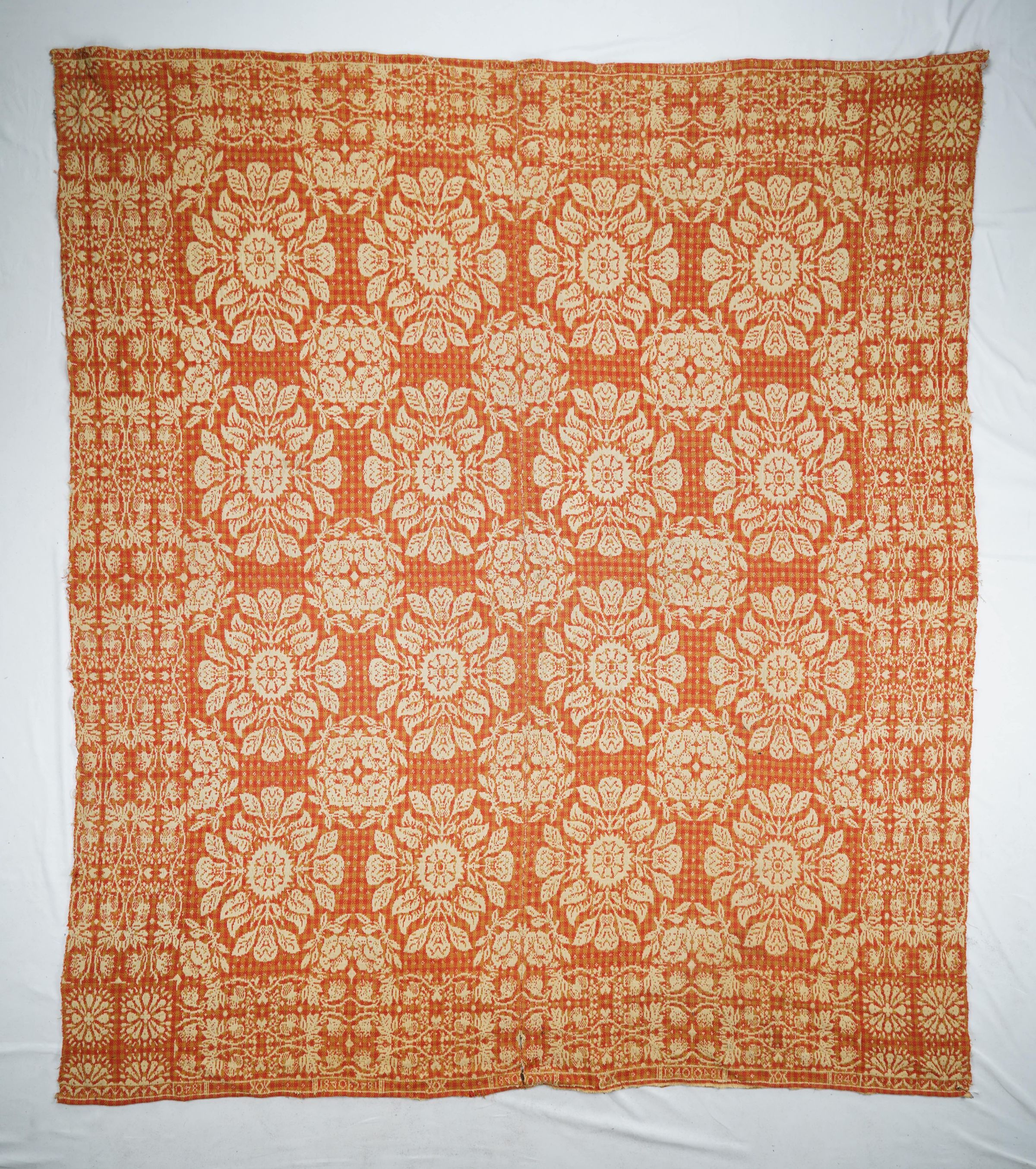 Natural, red, and green figured doubleweave coverlet; two panels joined by a center seam. No fringe; border on four sides.Collection