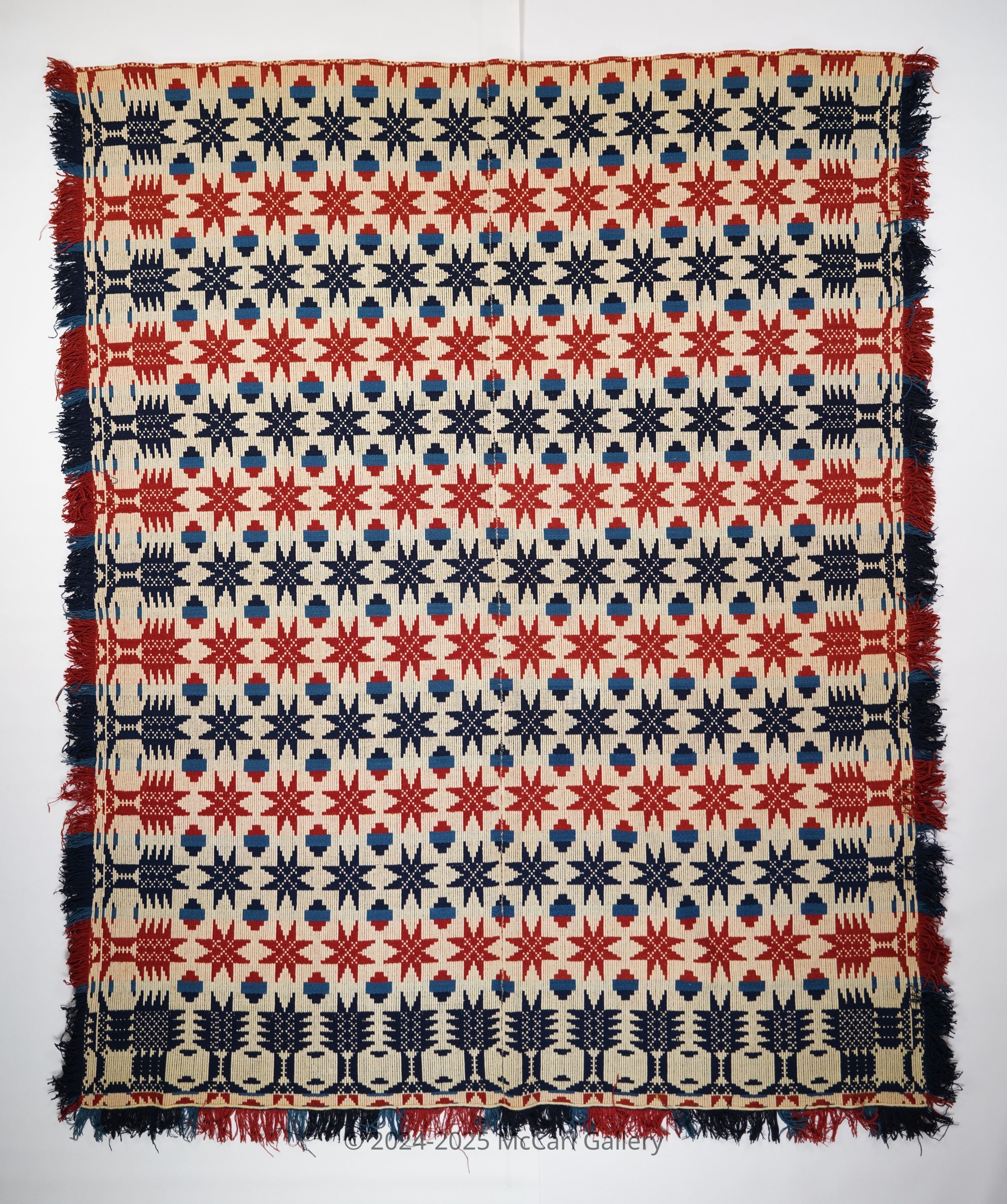 Red, blue, navy, and natural geometric tied beiderwand coverlet with border and fringe on three sides. Two joined panels.Collection