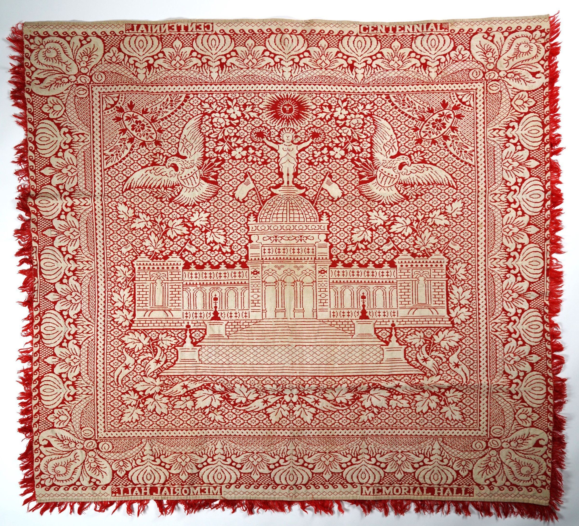 Red and natural figured Tied Beiderwand coverlet; seamless; floral borders on four sides, self-fringe on sides, applied fringe on bottom edge. "Memorial Hall" commemorative centennial pattern.