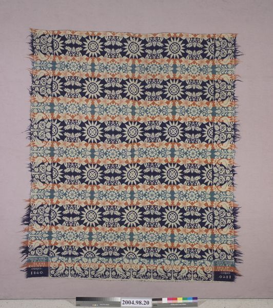 Figured coverlet undyed and blue cotton and blue, red, and aqua wool, tied double cloth (Beiderwand). Coverlet has two panels joined by a center seam. Hemmed at top, fringed on other three sides. Central motif is an all over pattern of small floral medallions, consisting of a wreath of four lilies surrounding an eight petaled flower within a sixteen-pointed star, alternating with small starburst medallions. Border of alternating birds, rose bushes, and trees runs along sides and bottom of coverlet.Collection