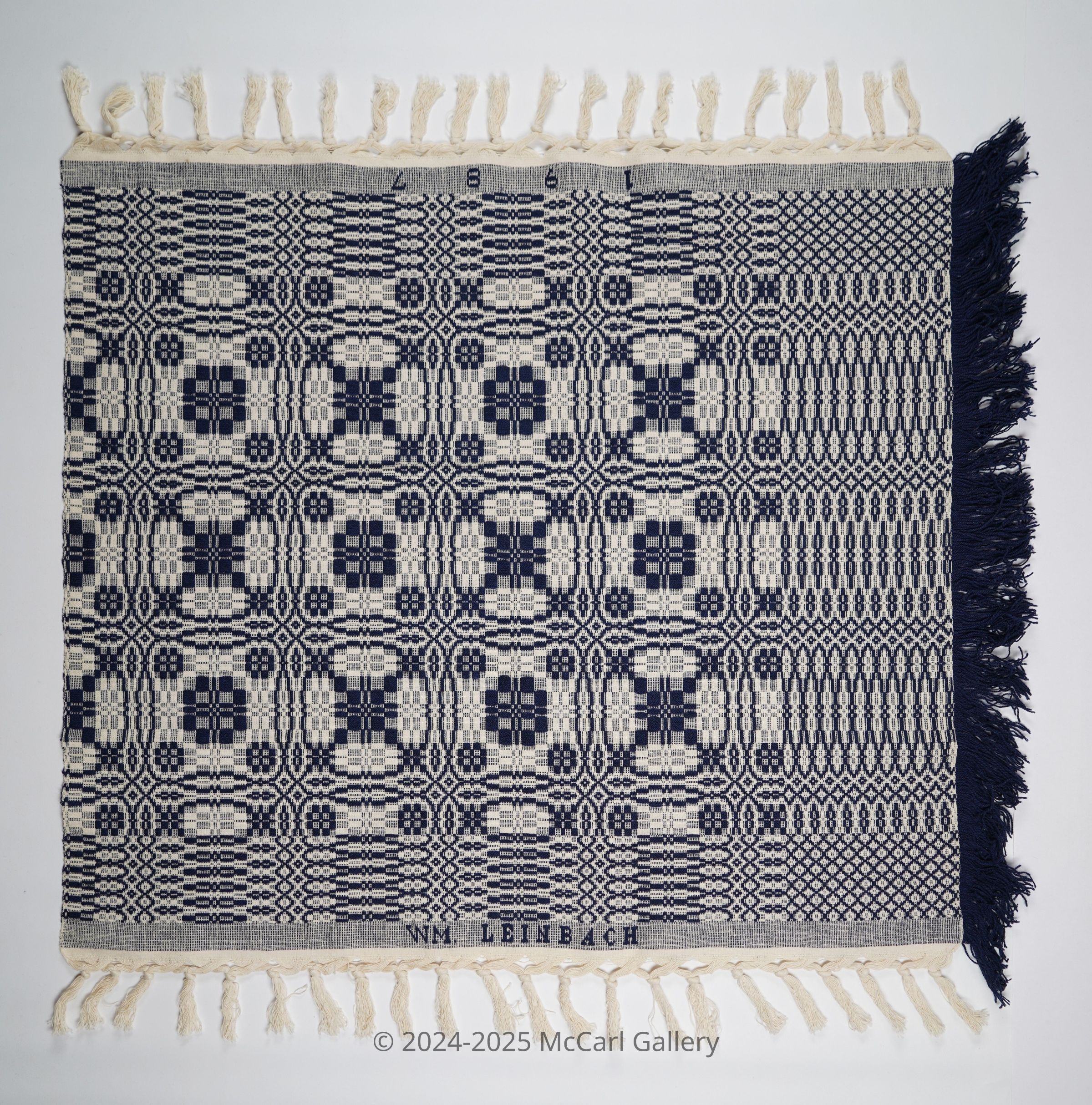 Navy and natural geometric overshot crib coverlet with border and self-fringe on three sides. Woven by William Leinbach in Myerstown, Lebanon Co., Pennsylvania in 1987.Collection