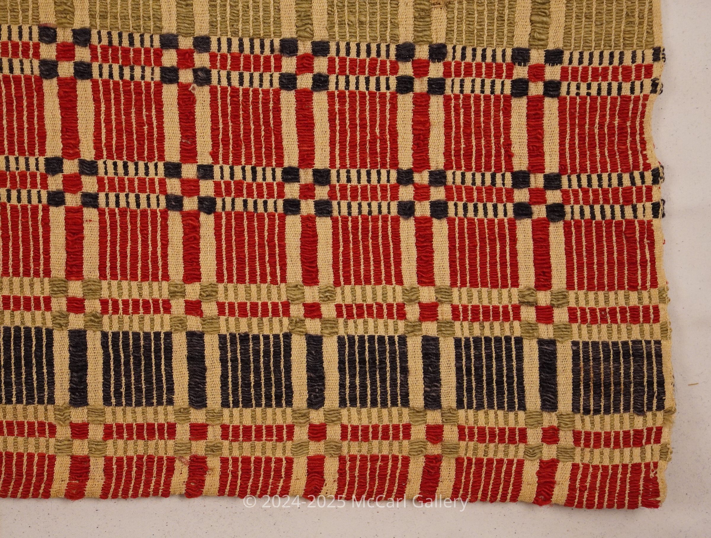 Natural, green, and red geometric monk's belt coverlet; three panels joined by equidistant seams. No border or fringe.Collection