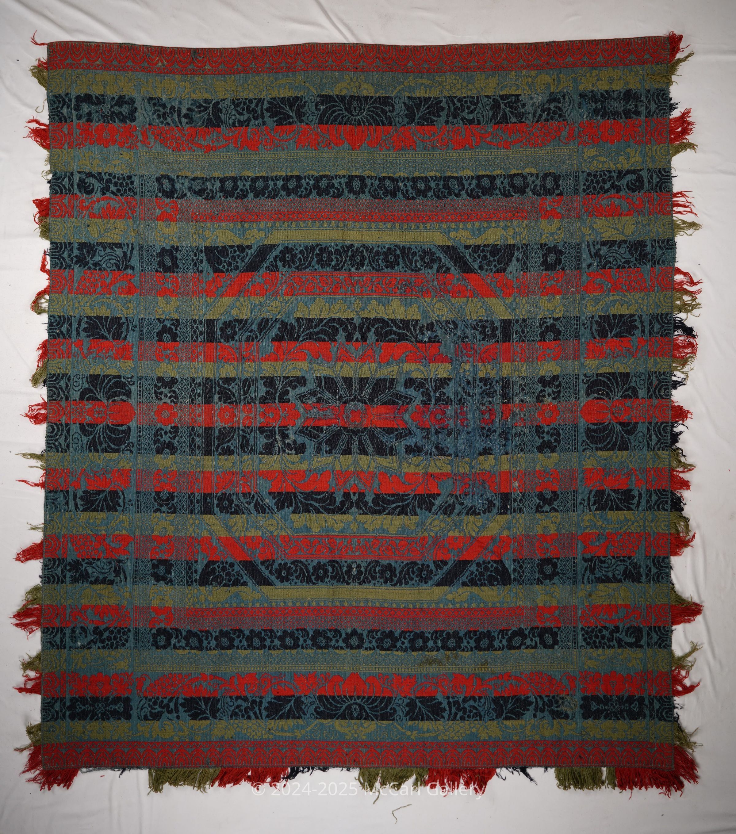 Blue, red, green, and navy figured double weave coverlet; seamless. Border on four sides; fringe on three sides.