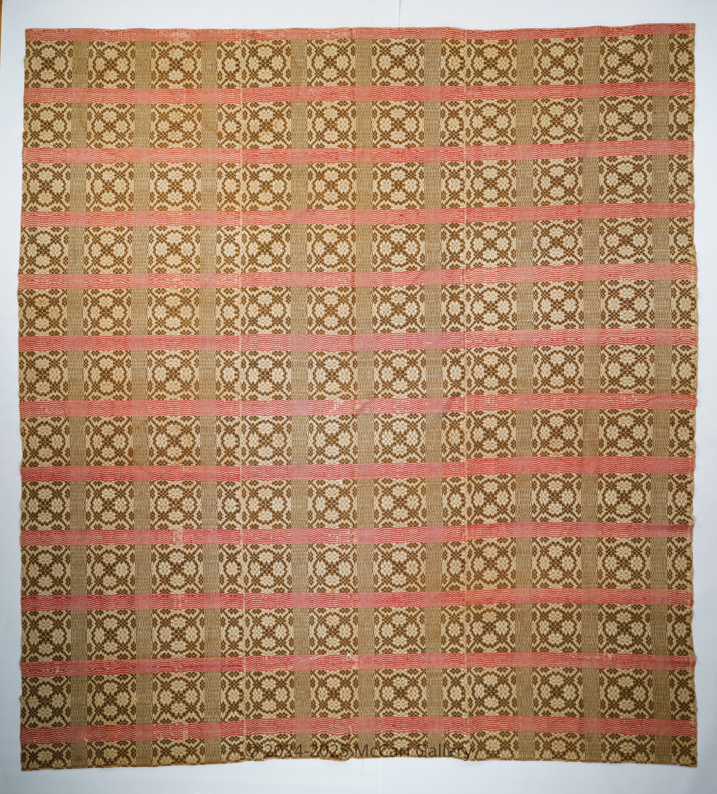 Red, burnt sienna, and natural geometric overshot coverlet. Two joined panels.