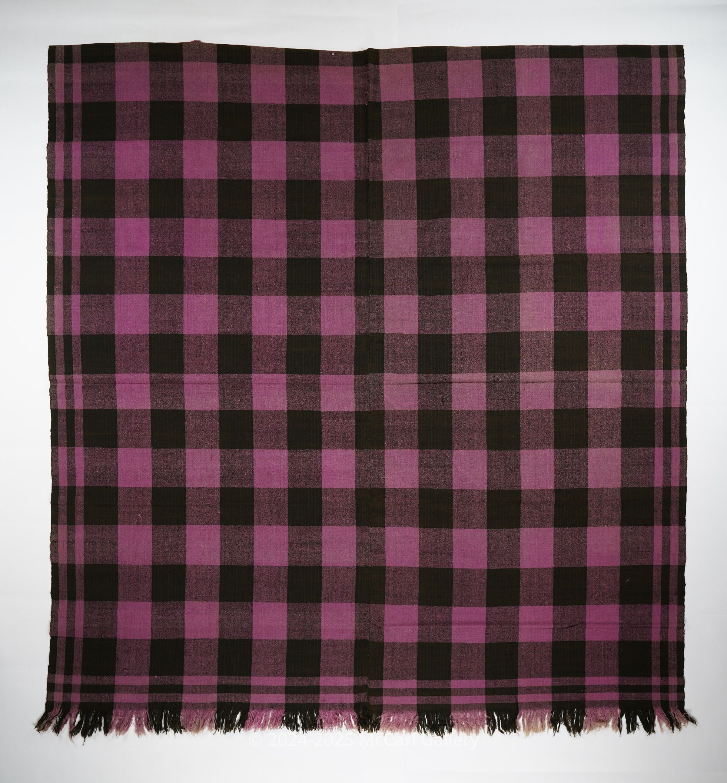 Pink and black geometric plain weave coverlet with border on three sides and fringe along bottom. Two joined panels.