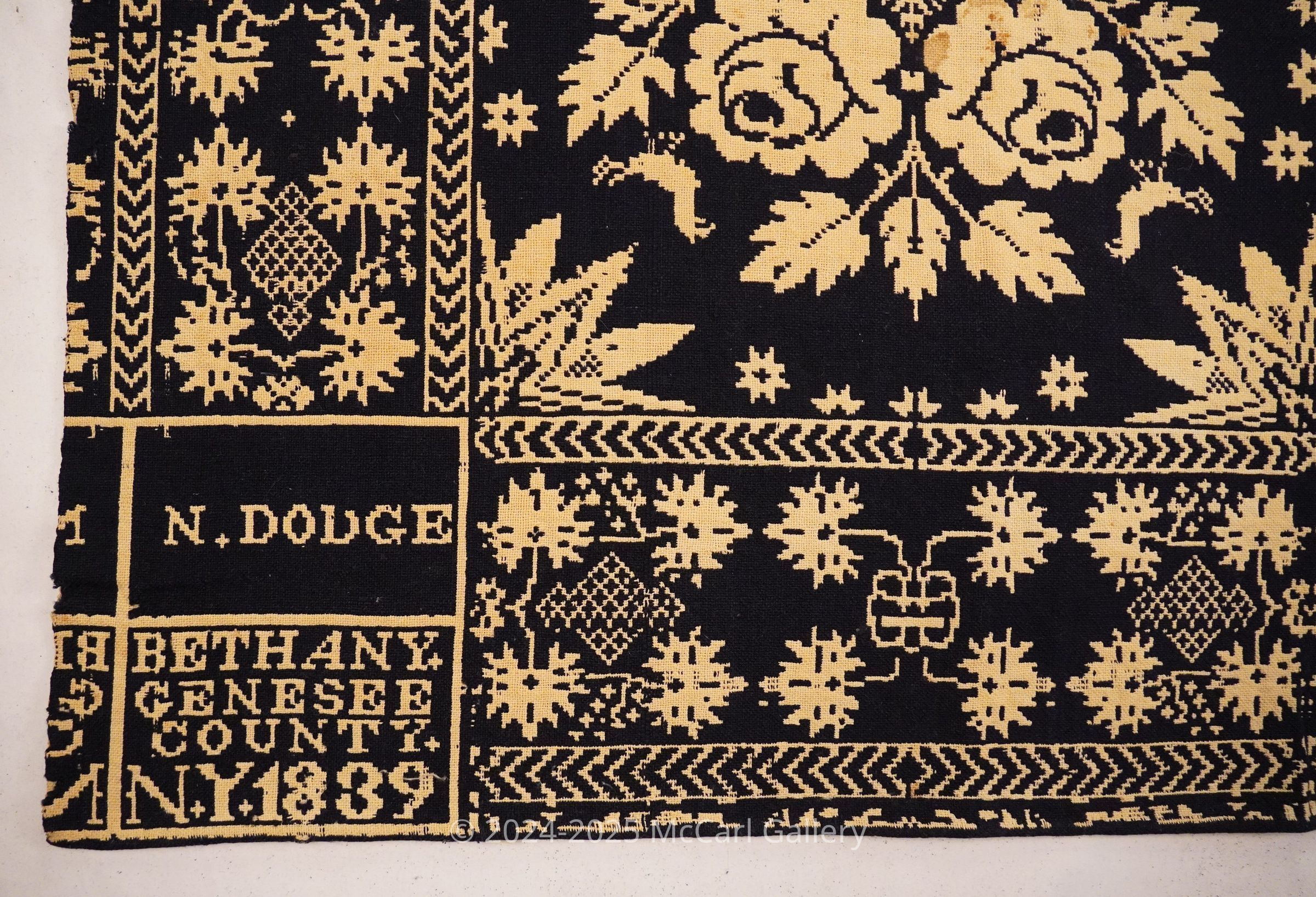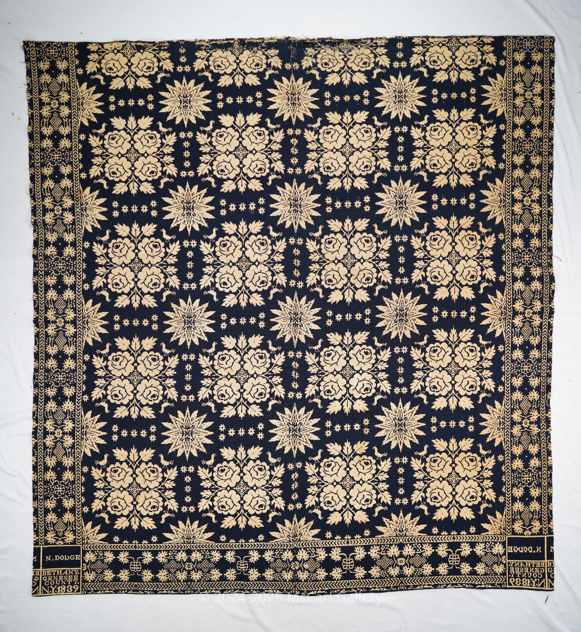 Natural and navy figured double weave coverlet; two panels joined by a center seam. Border on three sides; no fringe.Collection