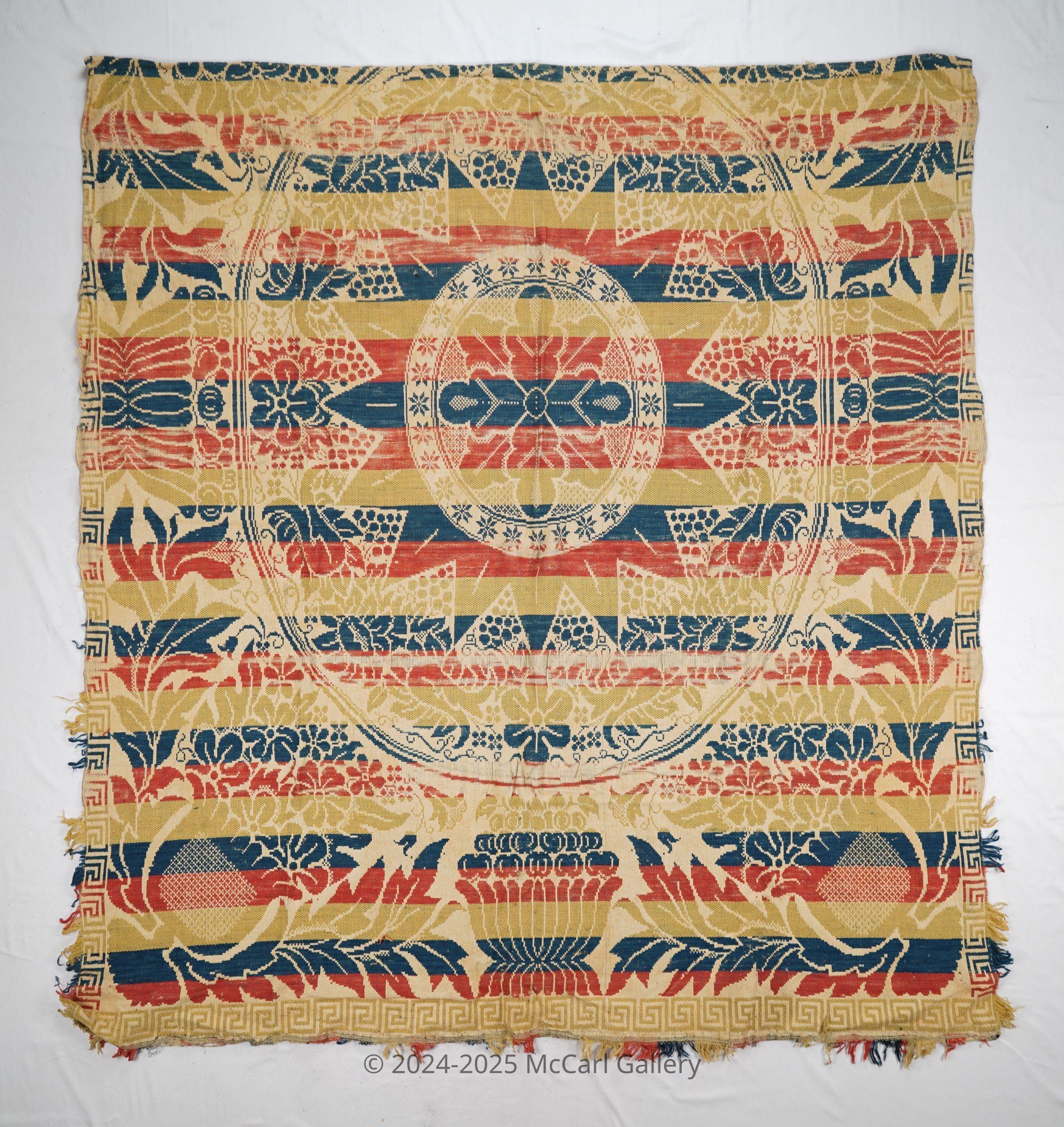 Natural, yellow, red, and blue figured true beiderwand coverlet; seamless. Border on three sides; poor fringe on three sides.Collection