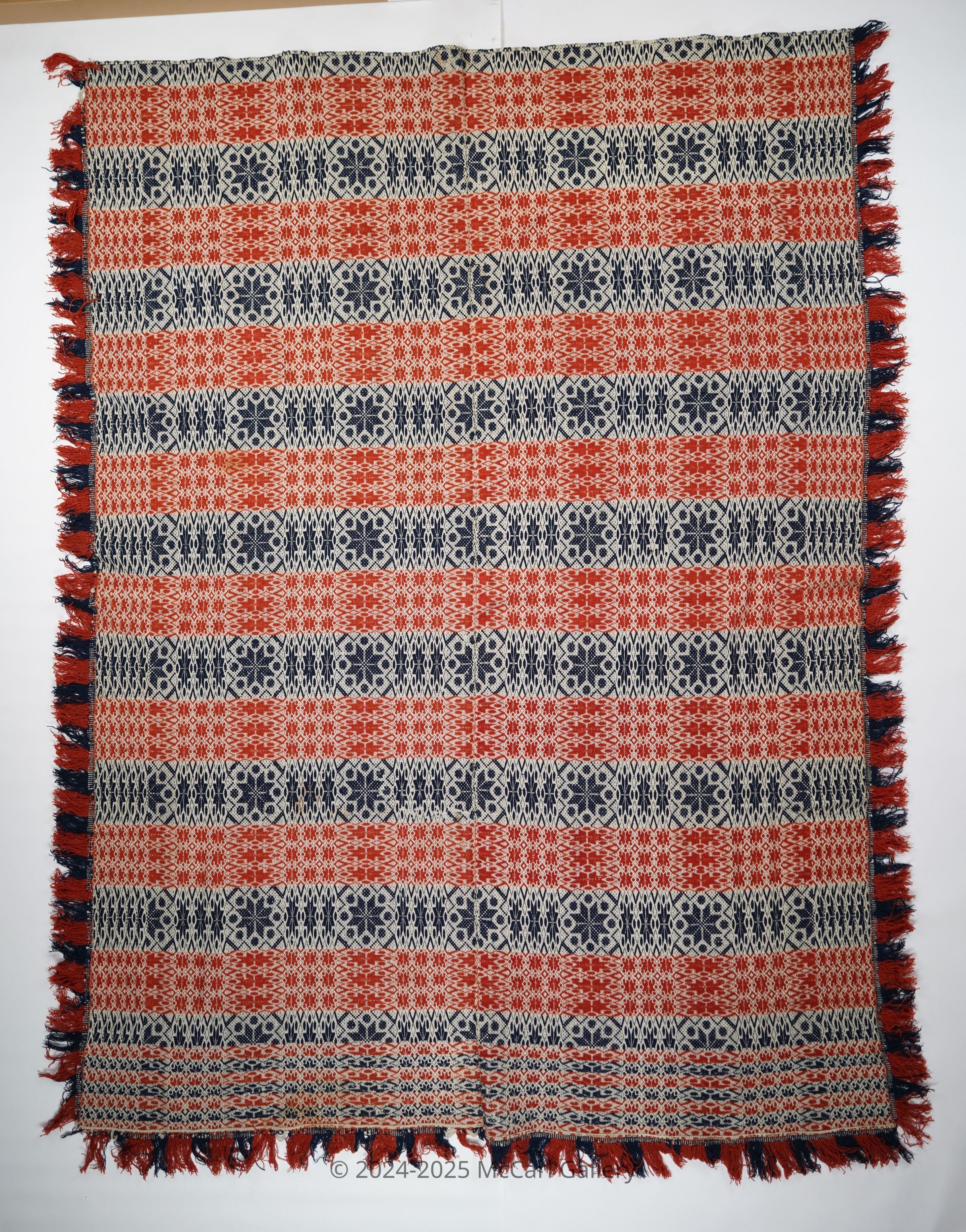 Red, navy, and natural geometric coverlet with border and applied fringe on three sides. Two joined panelsCollection