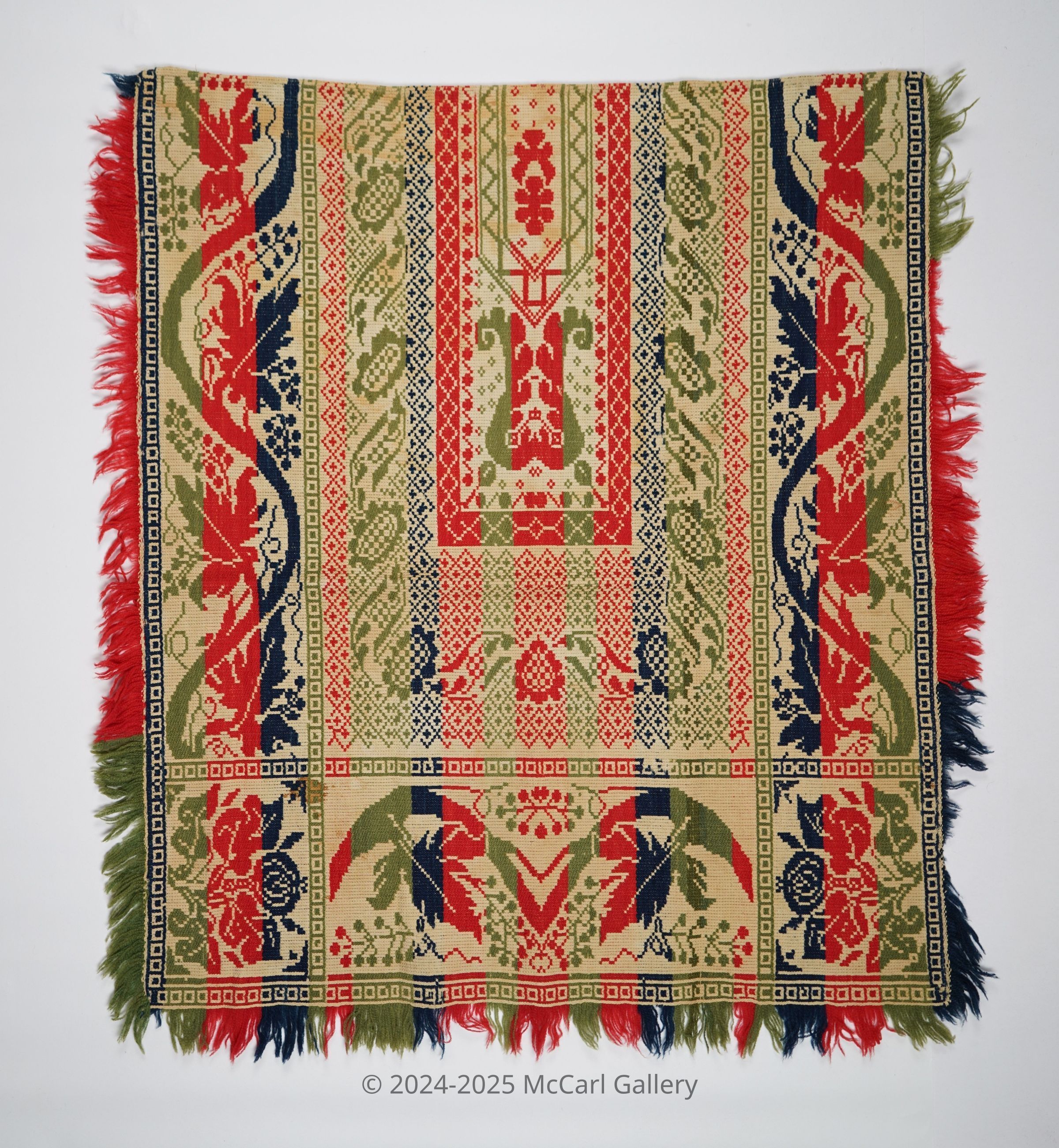 Green, red, navy, and natural figured tied half doublecloth crib coverlet with border and fringe on three sides.Collection