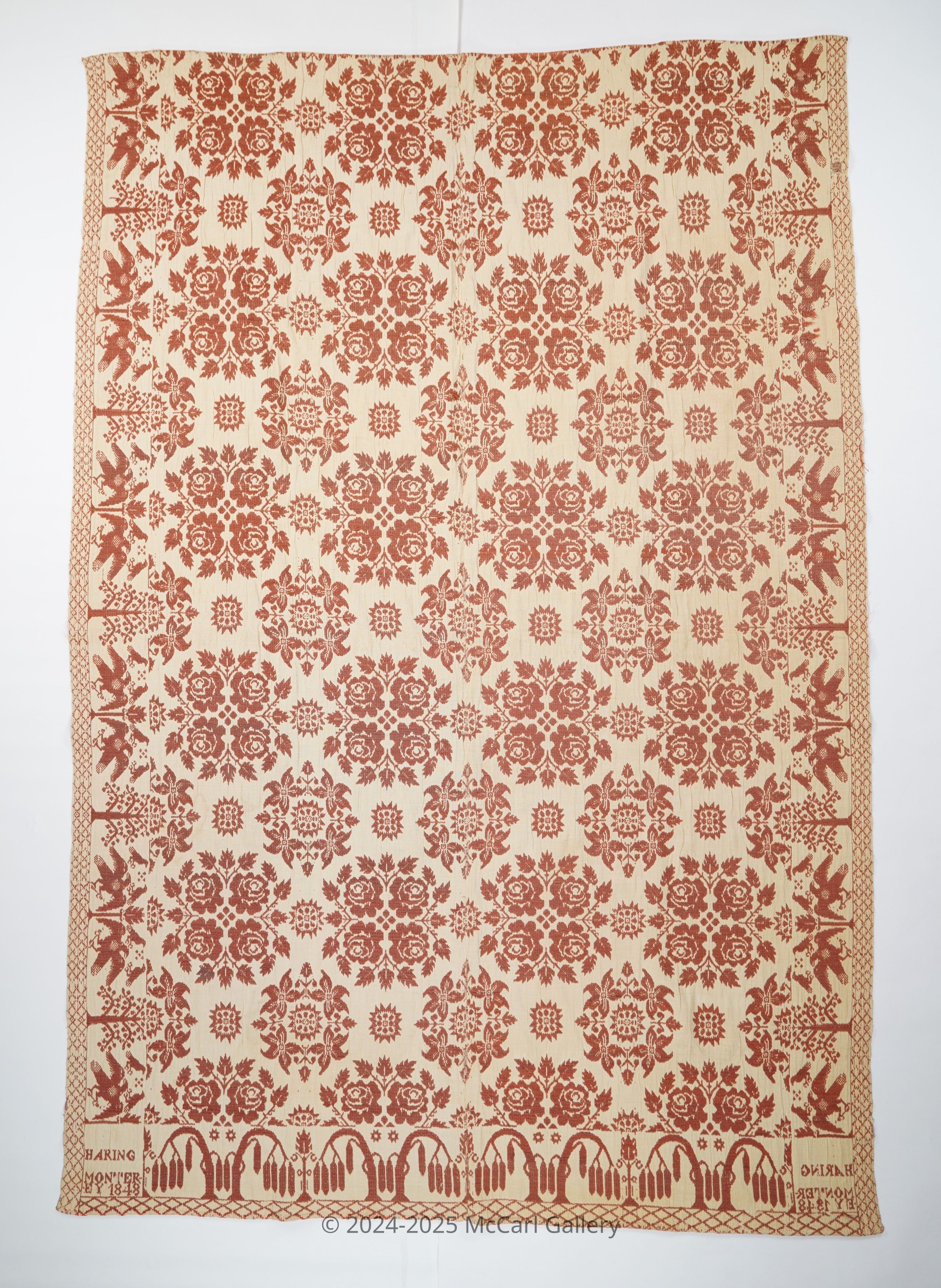 Red and natural figured double weave coverlet with border on three sides. Two joined panels. Woven for Haring in Monterey, Schuyler Co., New York in 1848.Collection