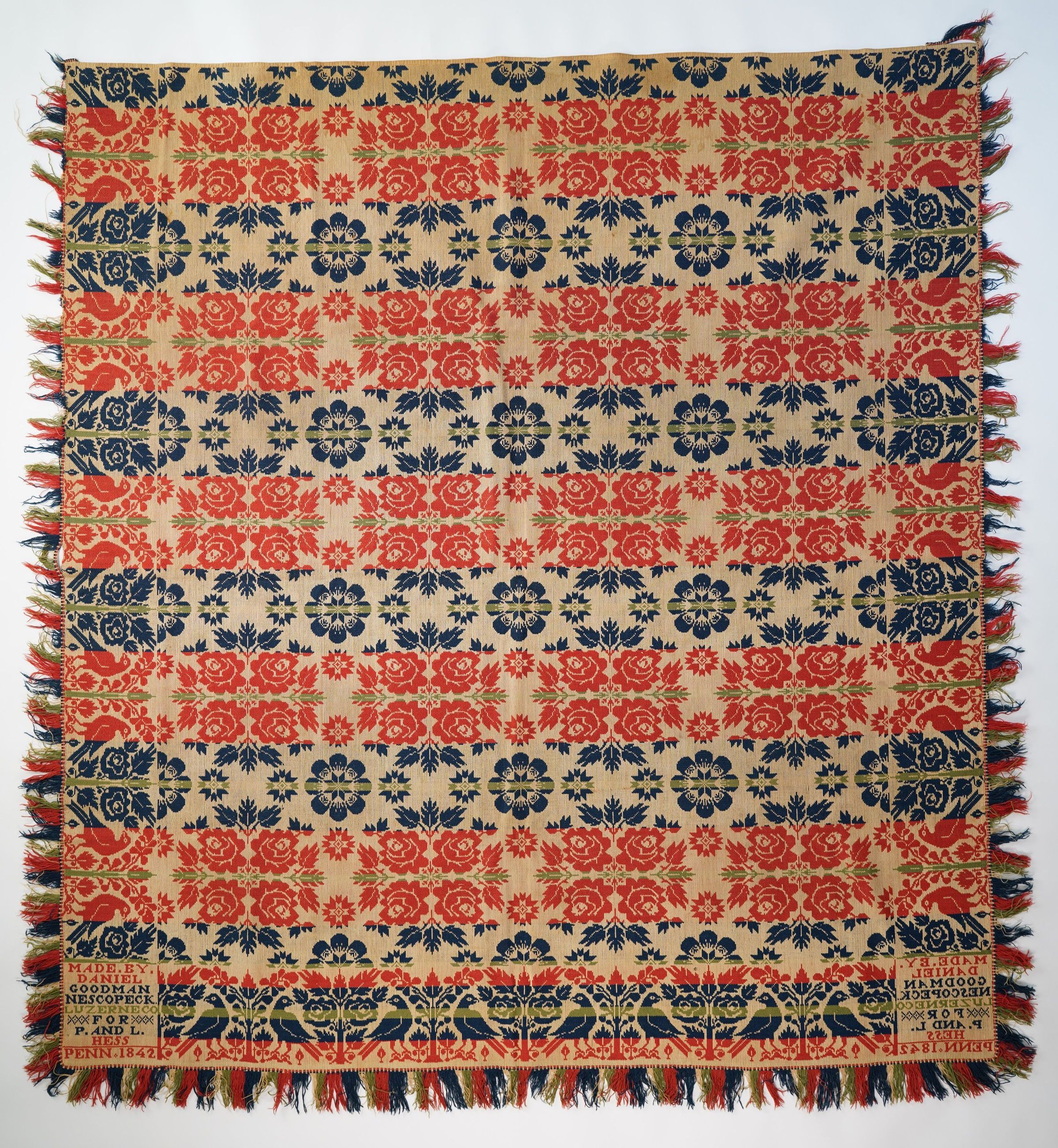 Navy, red, and green figured Tied Beiderwand coverlet; seamless; applied fringe on three sides; distelfink border; double rose and blossom centerfield pattern.