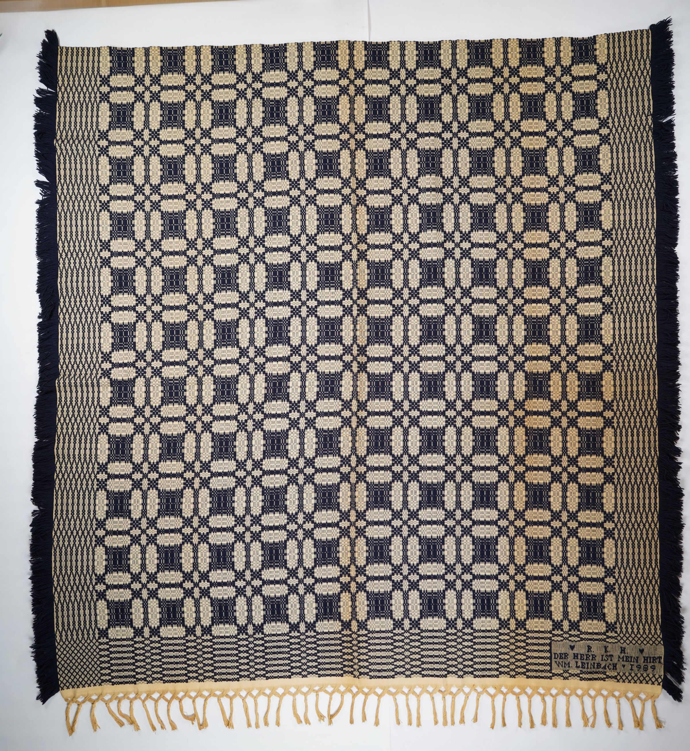 Reproduction navy and natural geometric overshot coverlet with self-fringe and border on three sides. Woven by William Leinbach for R. K. H. in 1989. Inscribed is "DER HERR IST MEIN HIRT" translated as "the Lord is my shepherd".Collection