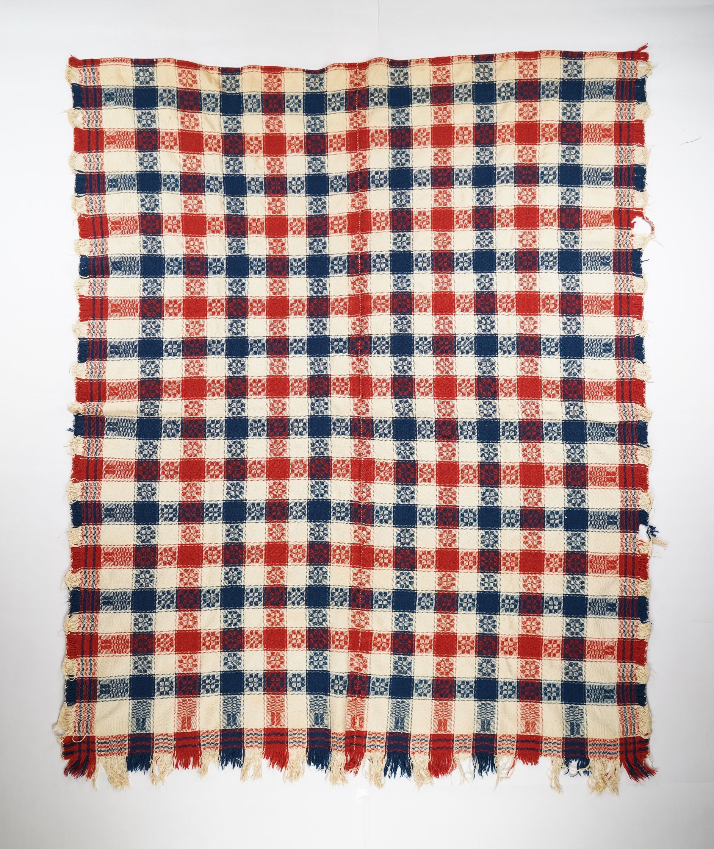 Geometric block twill coverlet with borders on 3 sides and self-fringe on both sides and bottom. Two panels joined by a center seam.Navy and red wool with undyed cotton. Plaid abstract stars centerfield pattern; pine tree border on sides and bottom. Unknown weaver.Context