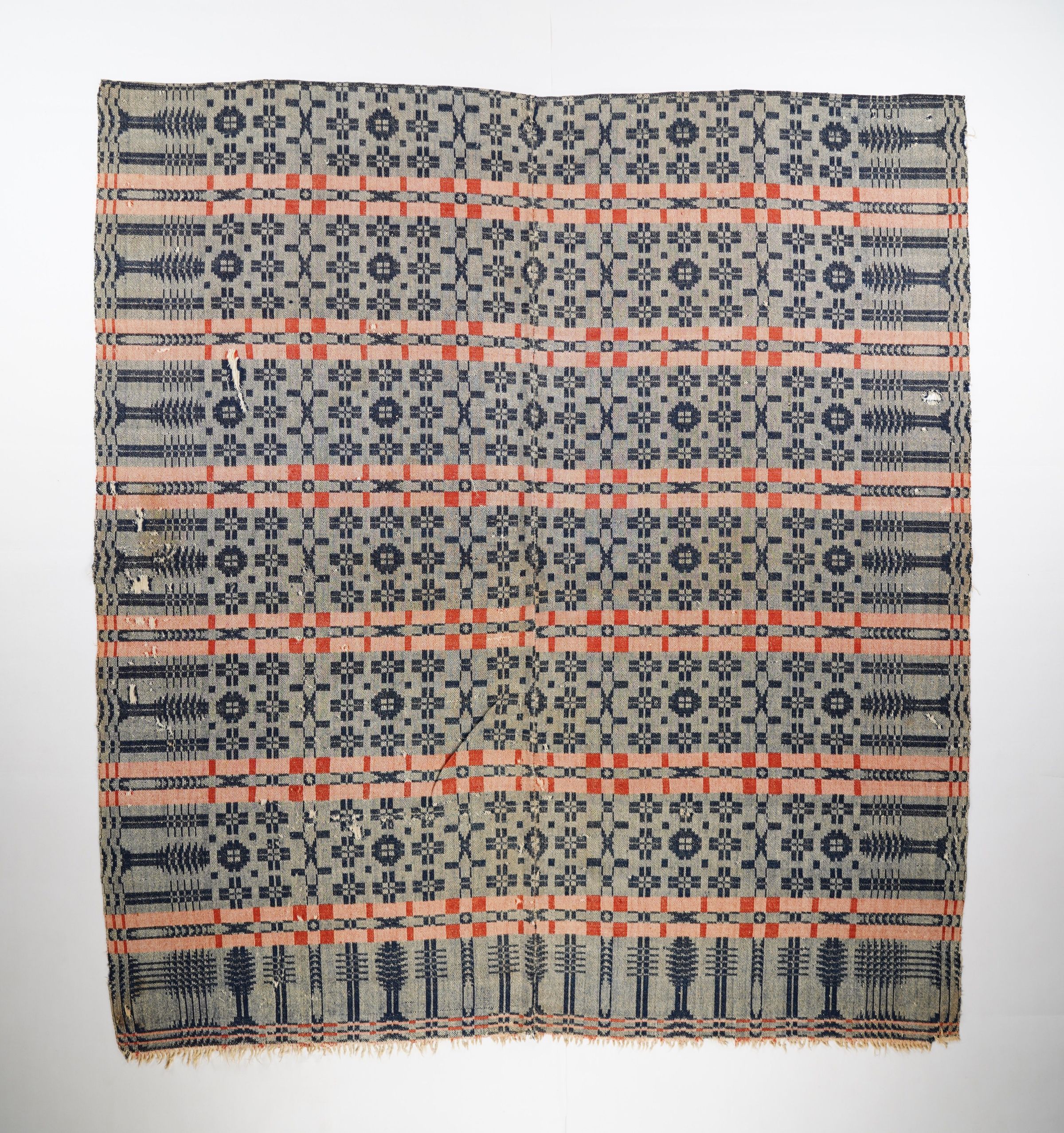 Geometric block twill coverlet with borders on 3 sides and self-fringe on the bottom. Two panels joined by a center seam. Navy and red wool with undyed cotton. Geometric centerfield with geometric borders on sides and bottom. Unknown weaver.Context