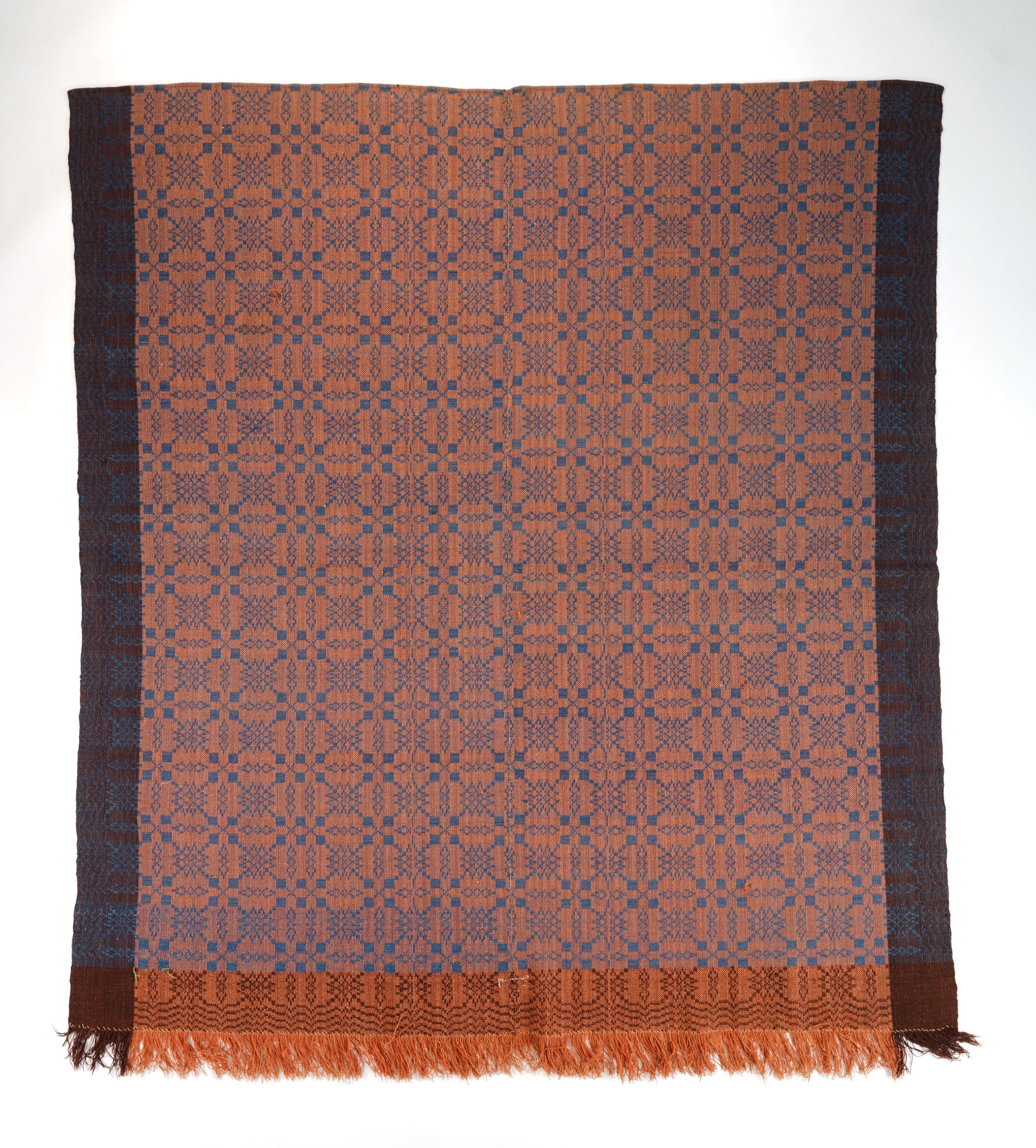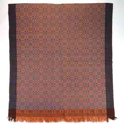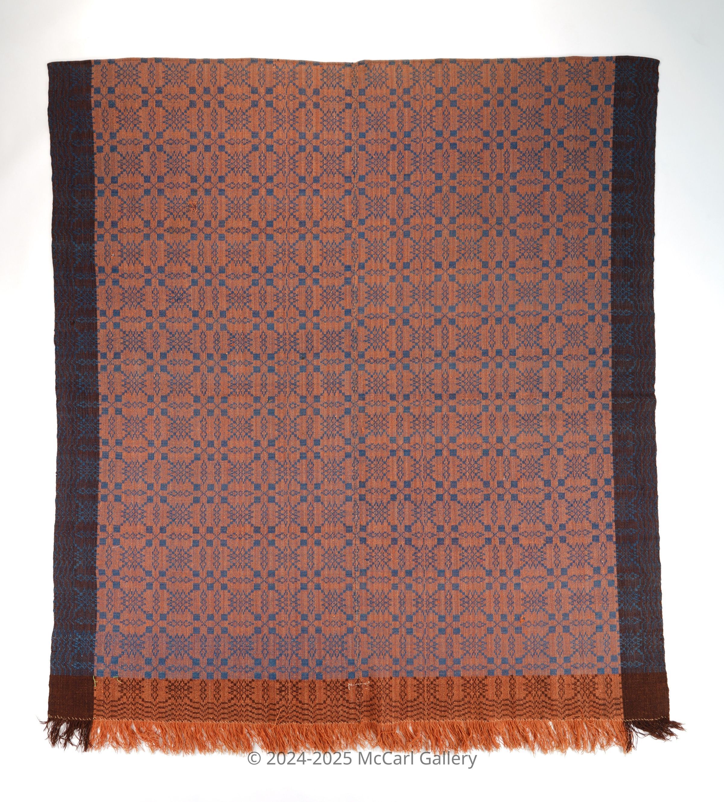 Geometric block twill coverlet with borders on three sides and self-fringe on bottom. Two panels joined by a center seam. Primarily red wool warp and blue wool weft, with brown wool borders.