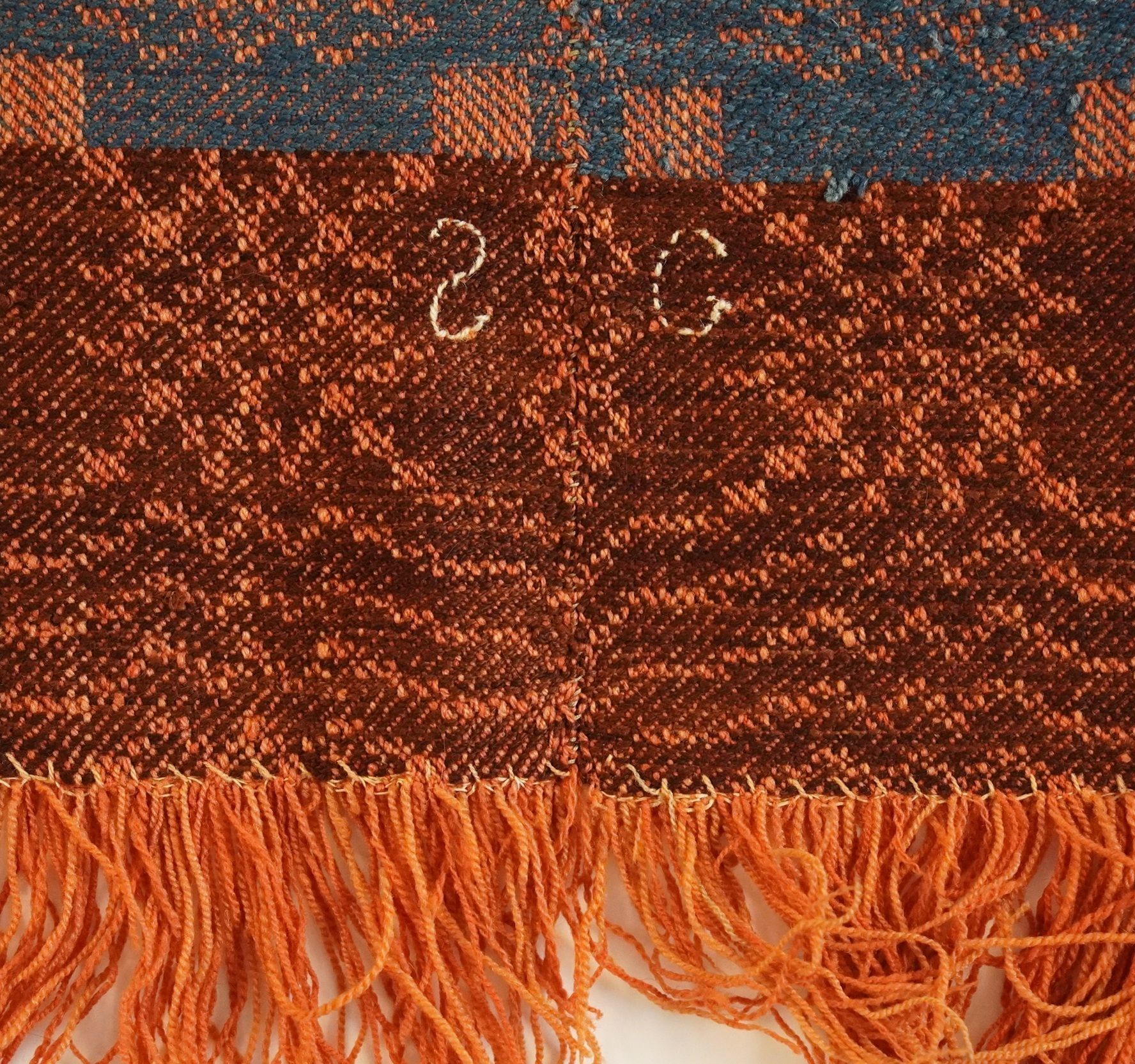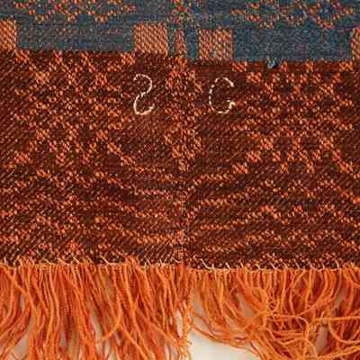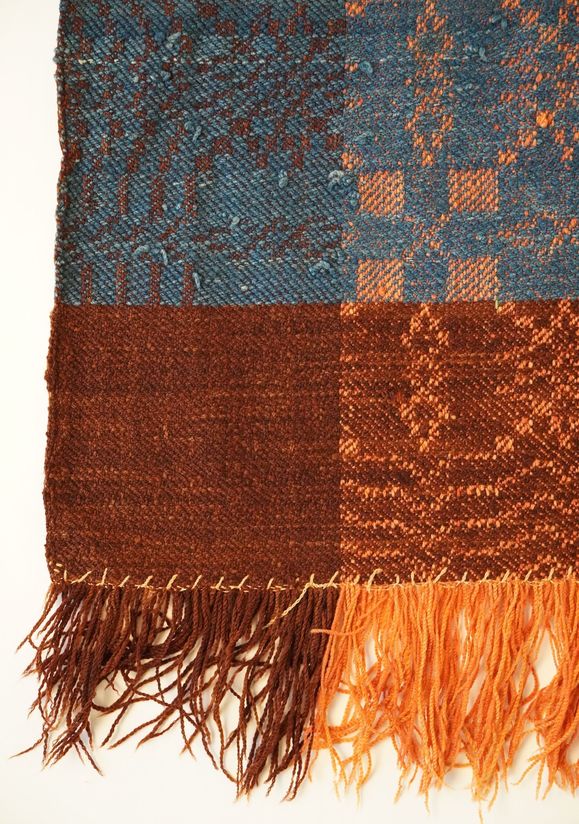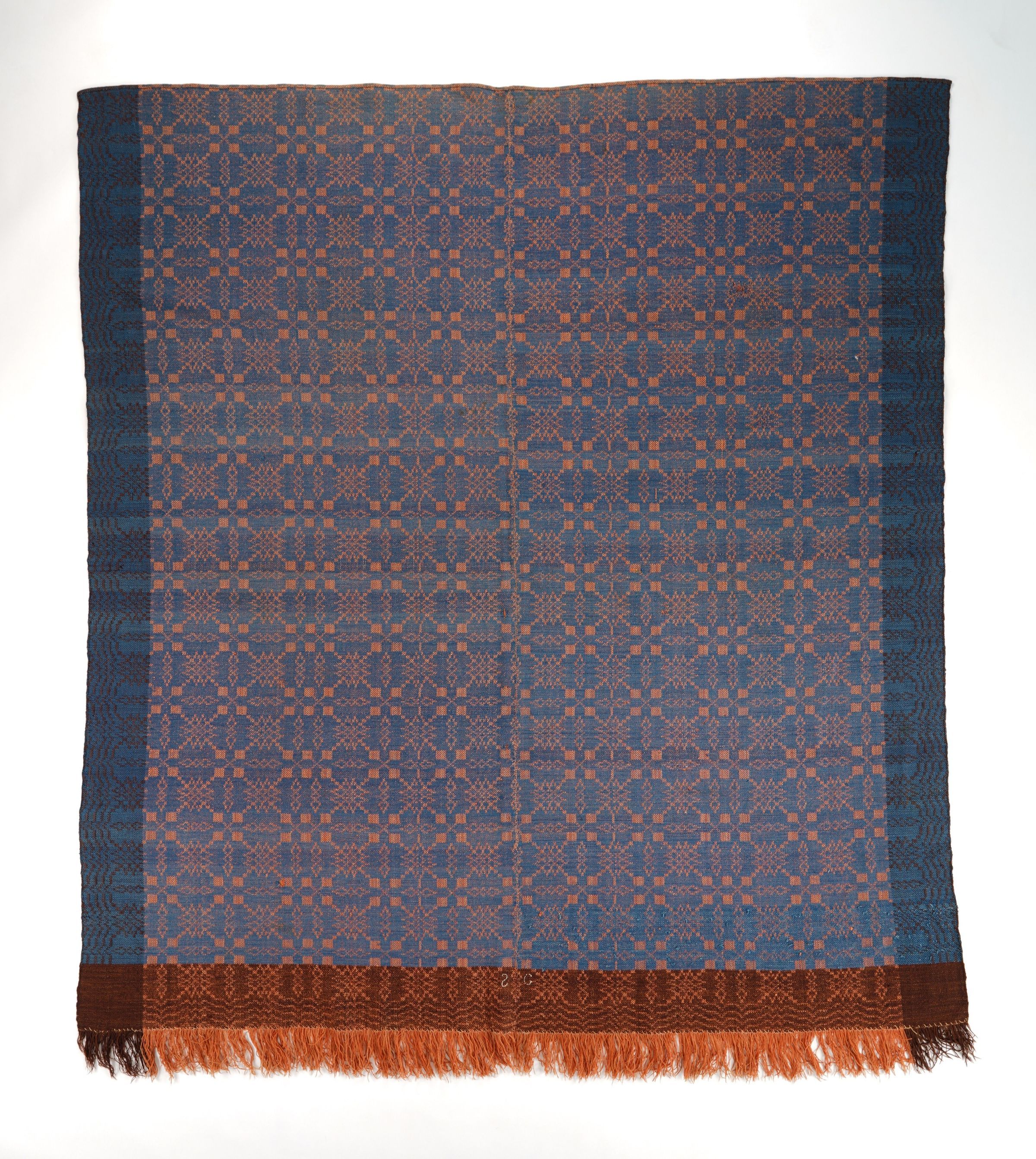 Geometric block twill coverlet with borders on three sides and self-fringe on bottom. Two panels joined by a center seam. Primarily red wool warp and blue wool weft, with brown wool borders.