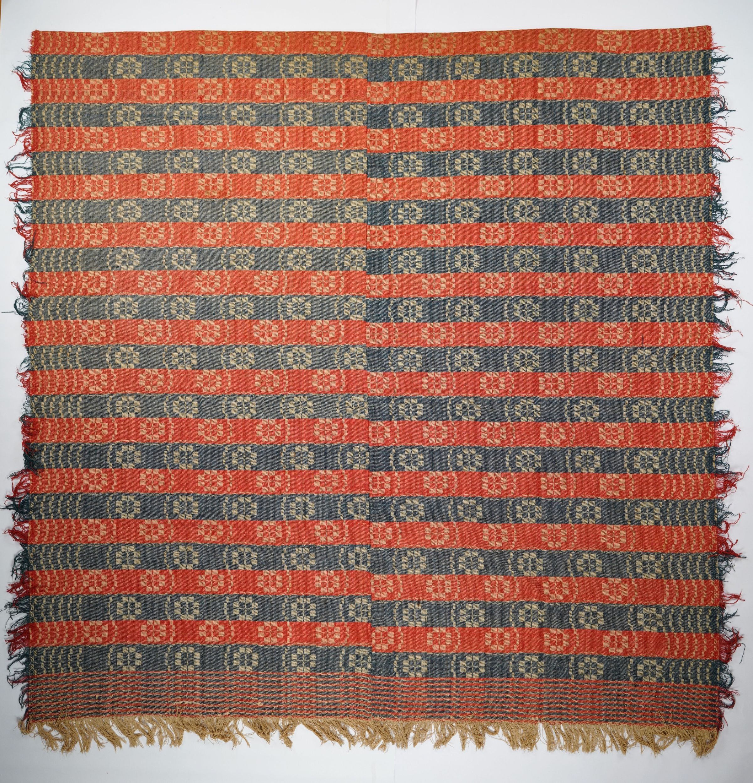 Red, navy, and natural geometric block twill coverlet with border and self-fringe on three sides. In the "Cat Track and Snail Trail" pattern. Two joined panels.Collection