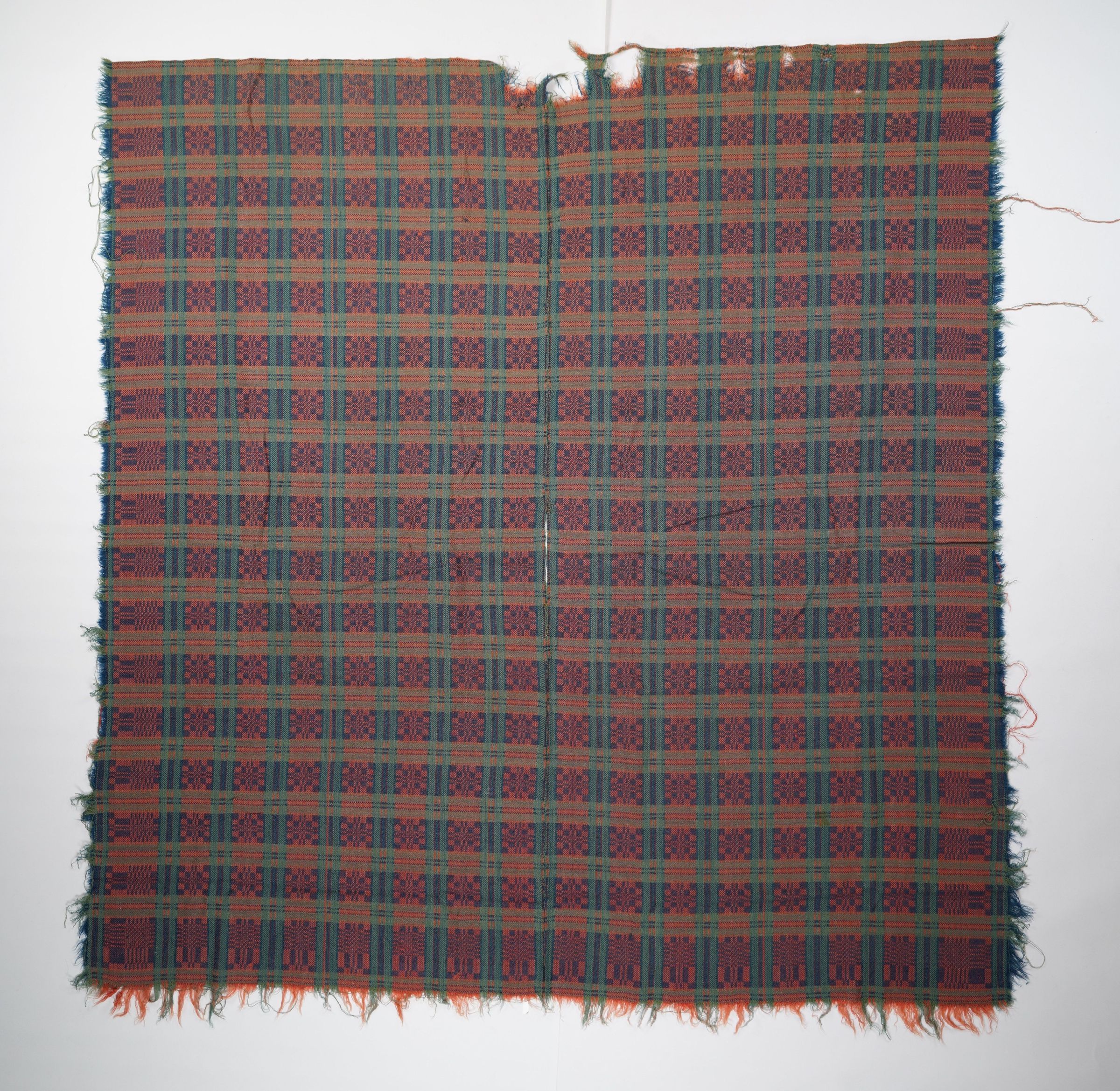 Navy, red, and blue geometric block will coverlet with border and self-fringe on three sides. Two joined panels.