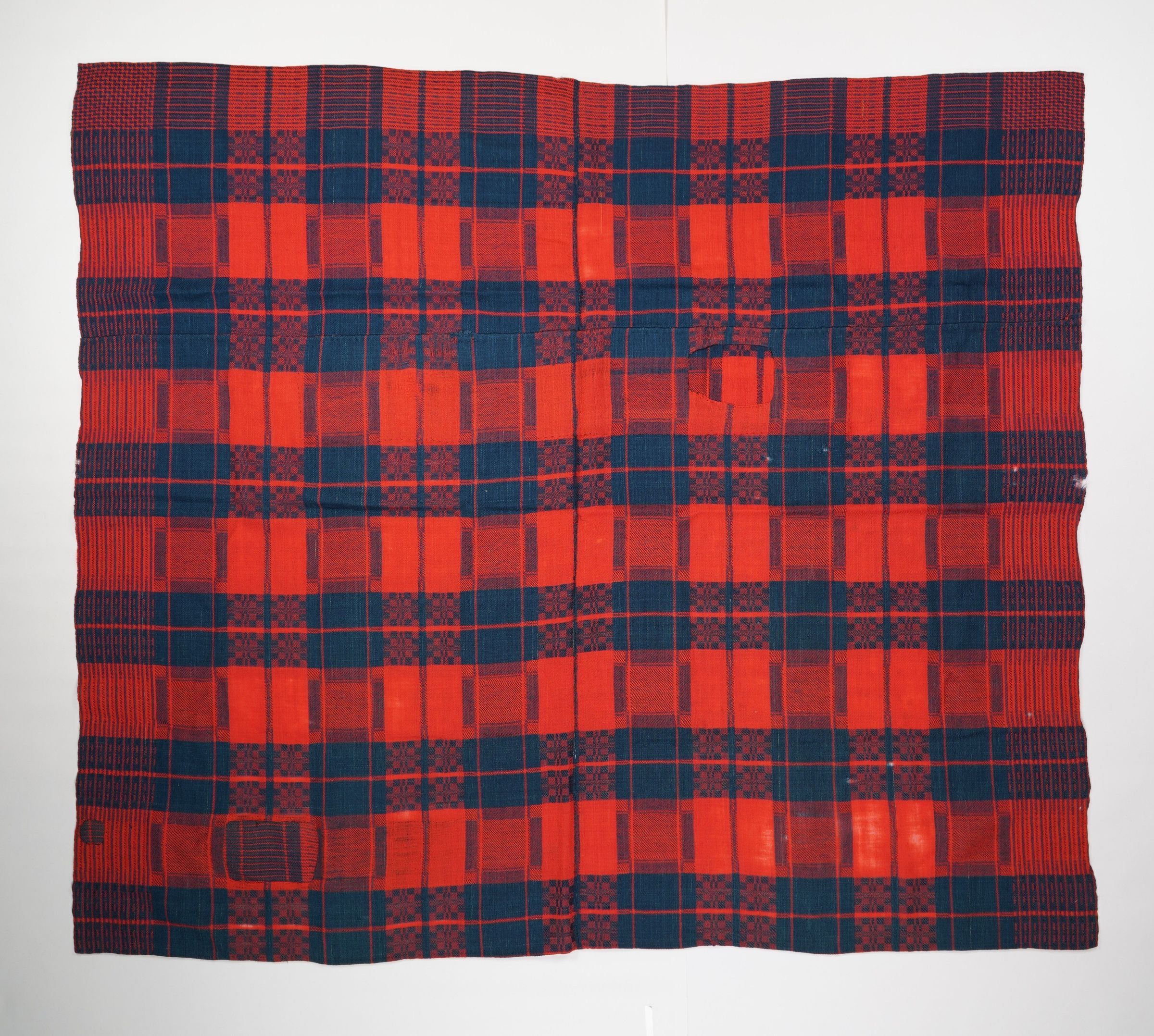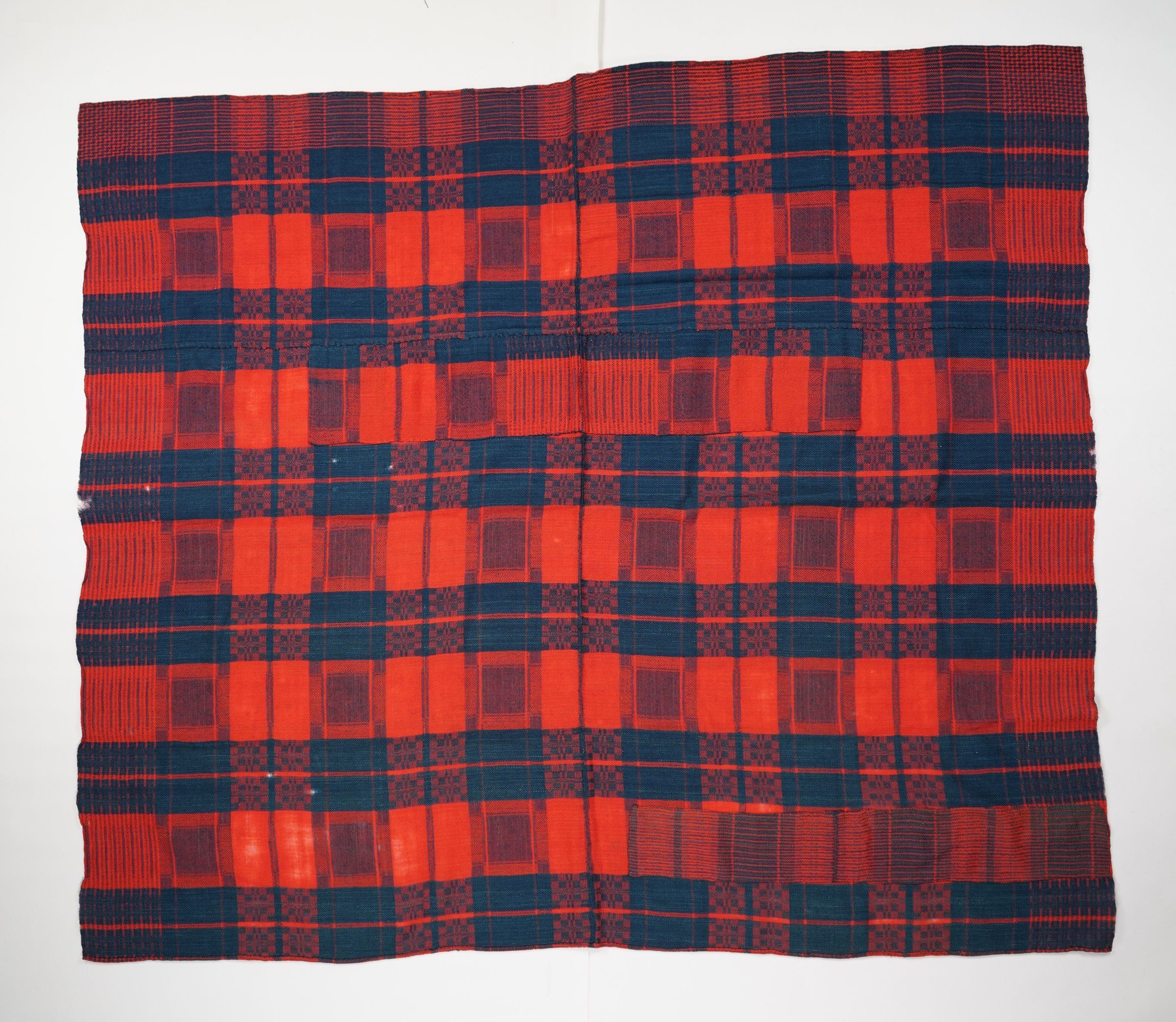 Red and navy geometric block twill coverlet with border on three sides. Two joined panels. Note the patches throughout both sides of the coverlet.Collection