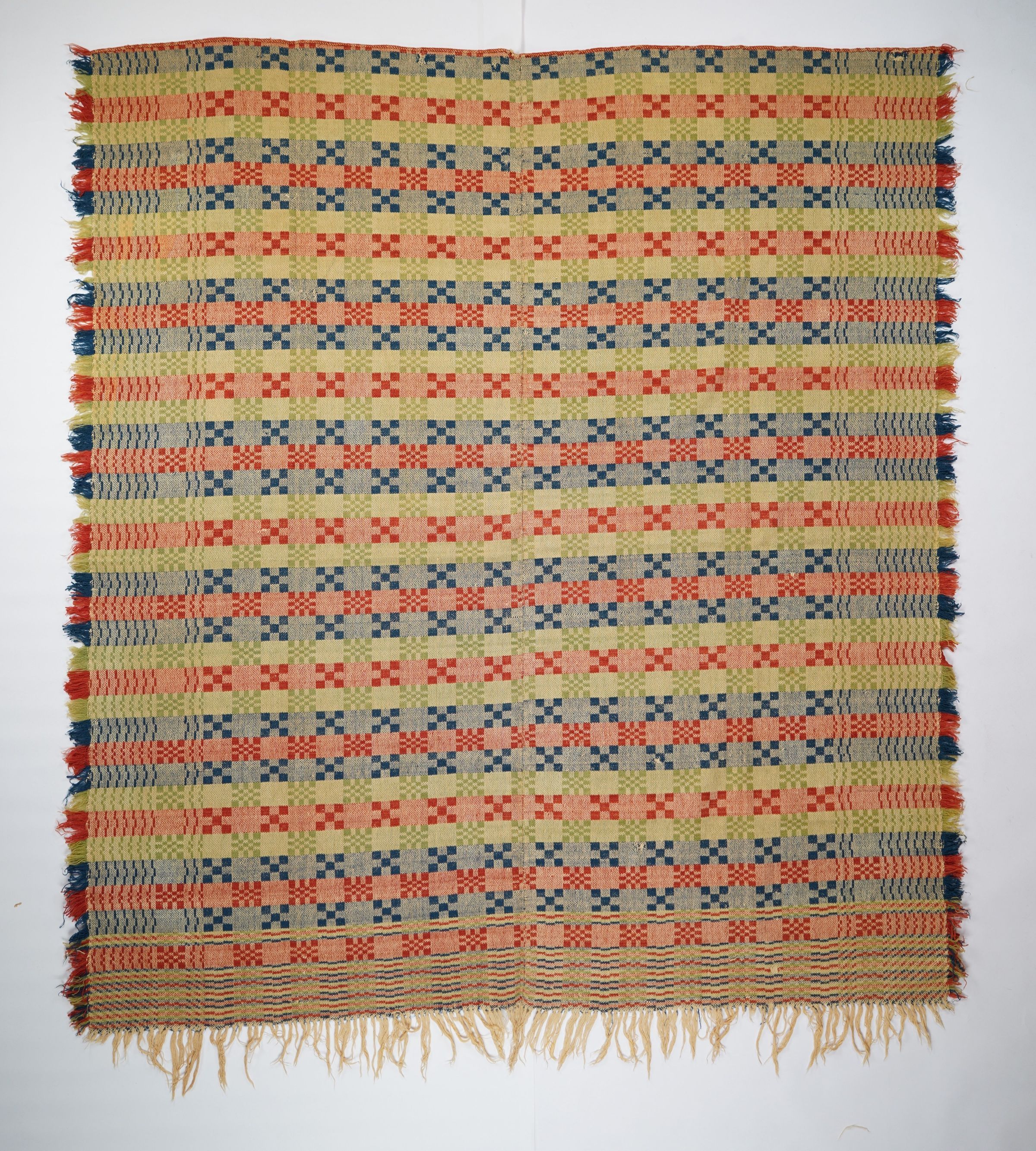 Green, navy, red, and natural geometric block twill coverlet with border and self-fringe on three sides. Two joined panels.Collection
