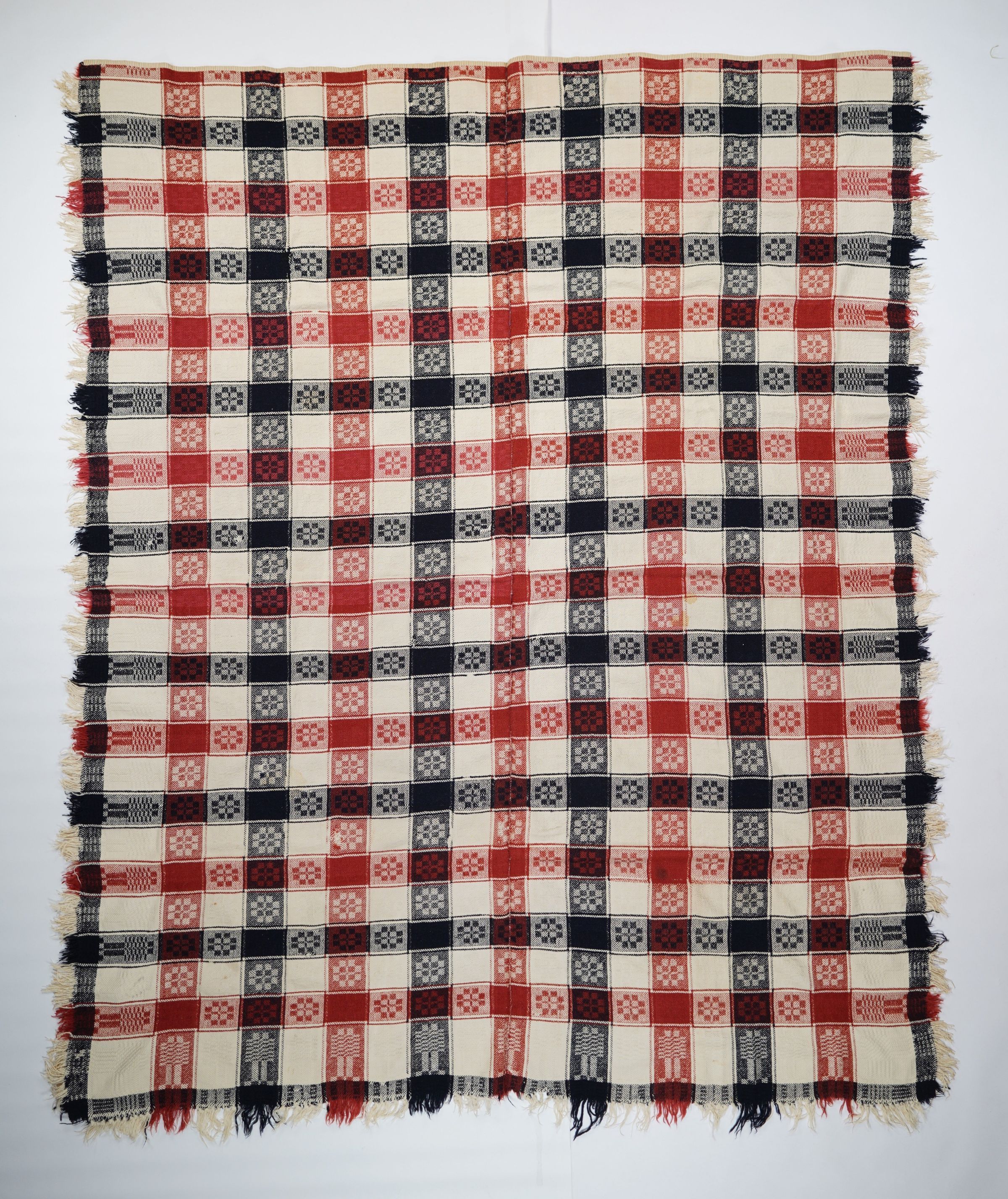 Red, navy, and natural geometric block twill coverlet with border and self-fringe on three sides. Two joined panels.