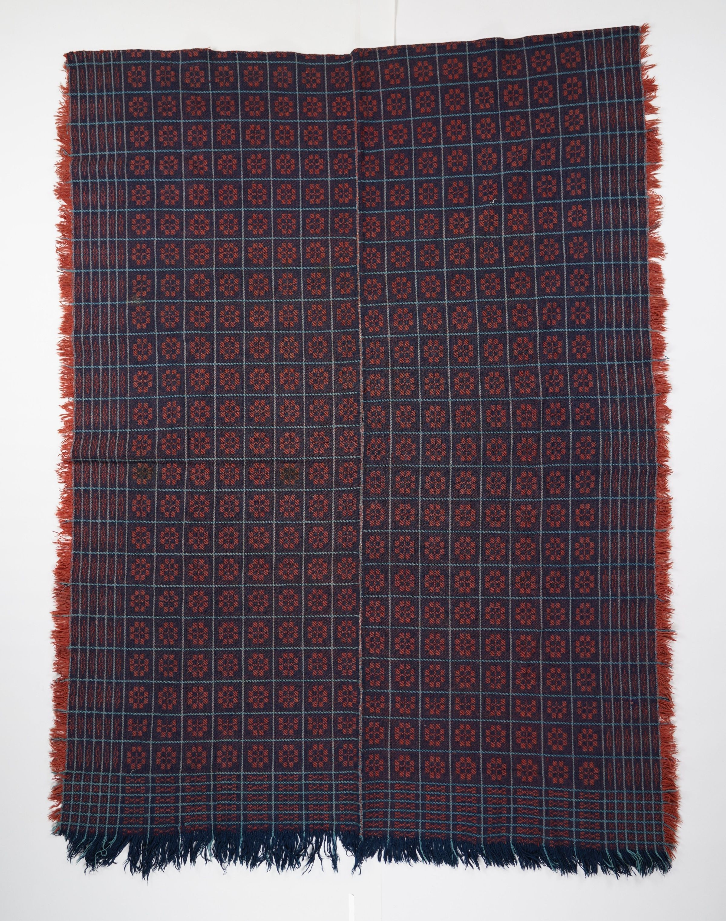 Red, blue, and navy geometric block twill coverlet with border and self-fringe on three sides. Two joined panels.