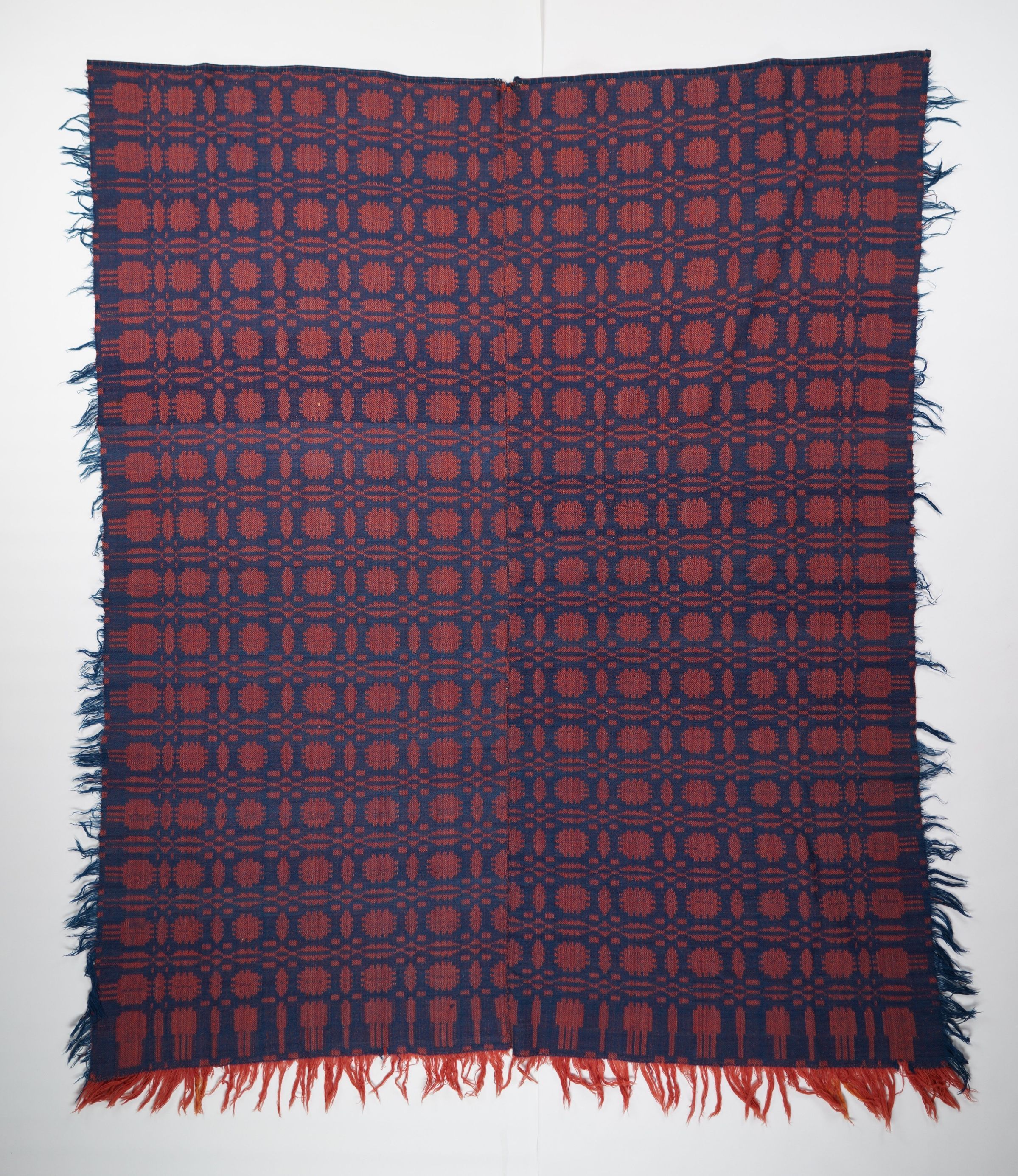 Navy and red geometric block twill coverlet with border and self-fringe on three sides. Two joined panels.