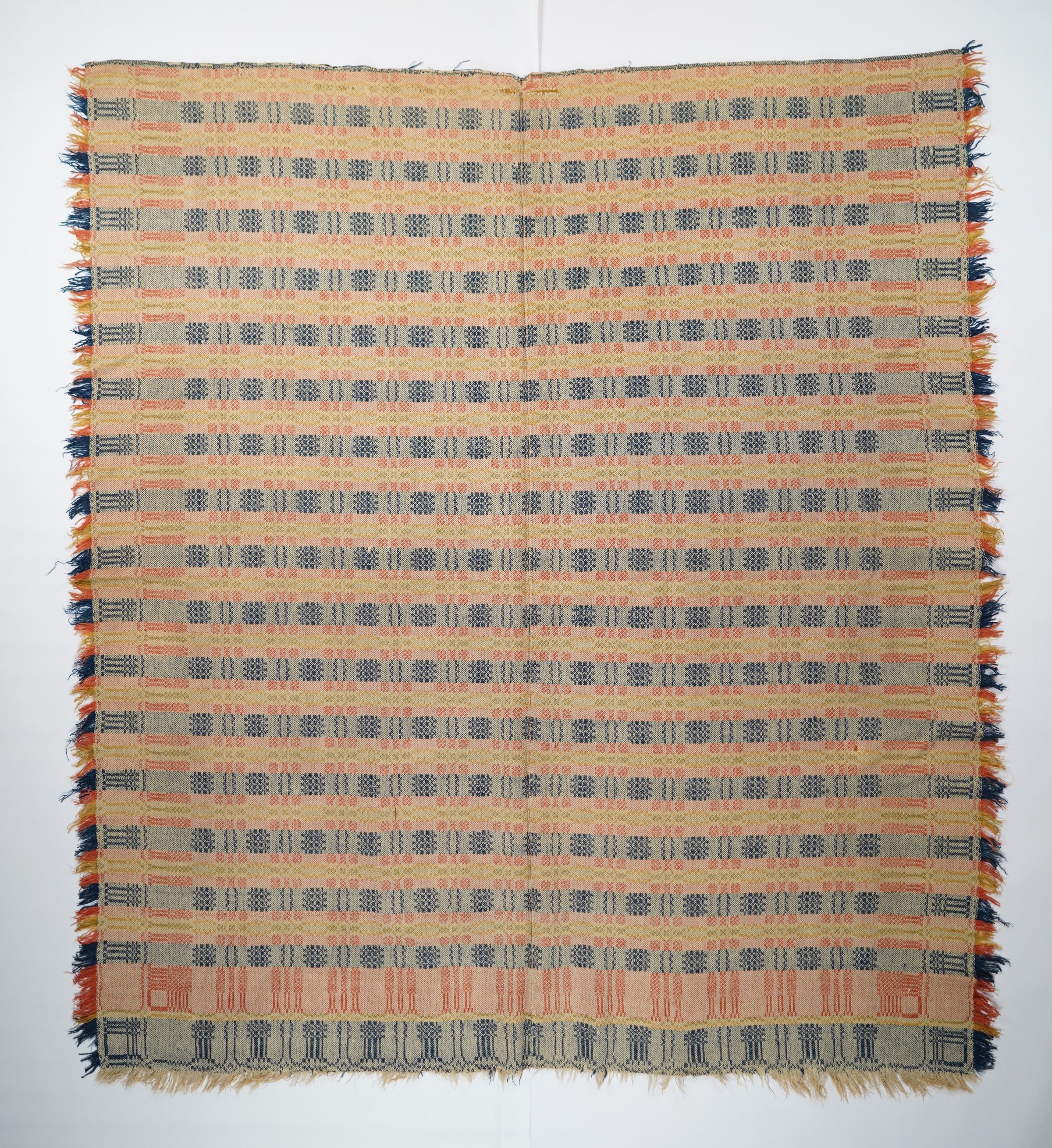 Red, navy, yellow, and natural geometric block twill coverlet with border and self-fringe on three sides. Two joined panels.Collection