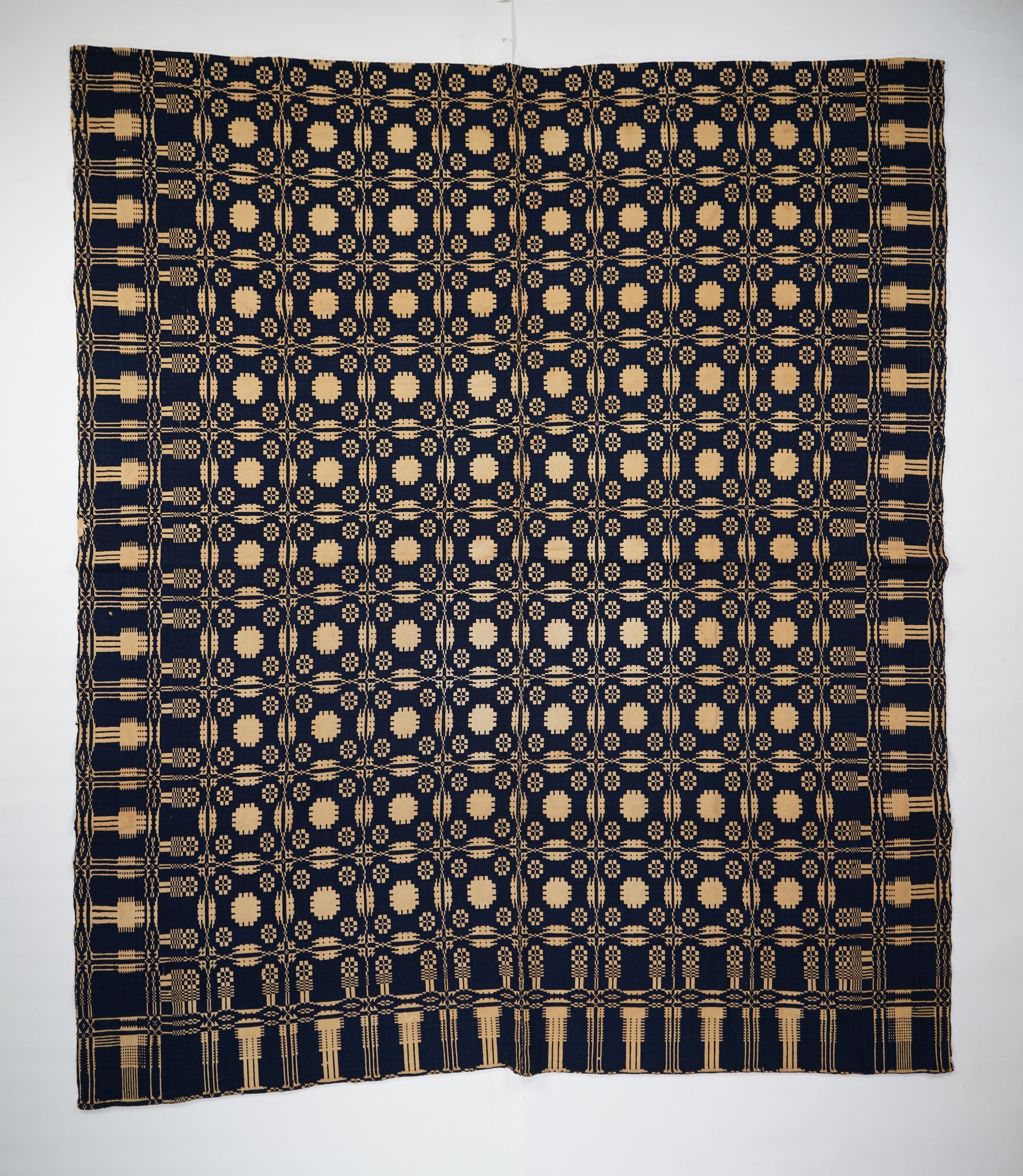 Navy and natural geometric double weave coverlet with border on three sides. Two joined panels.