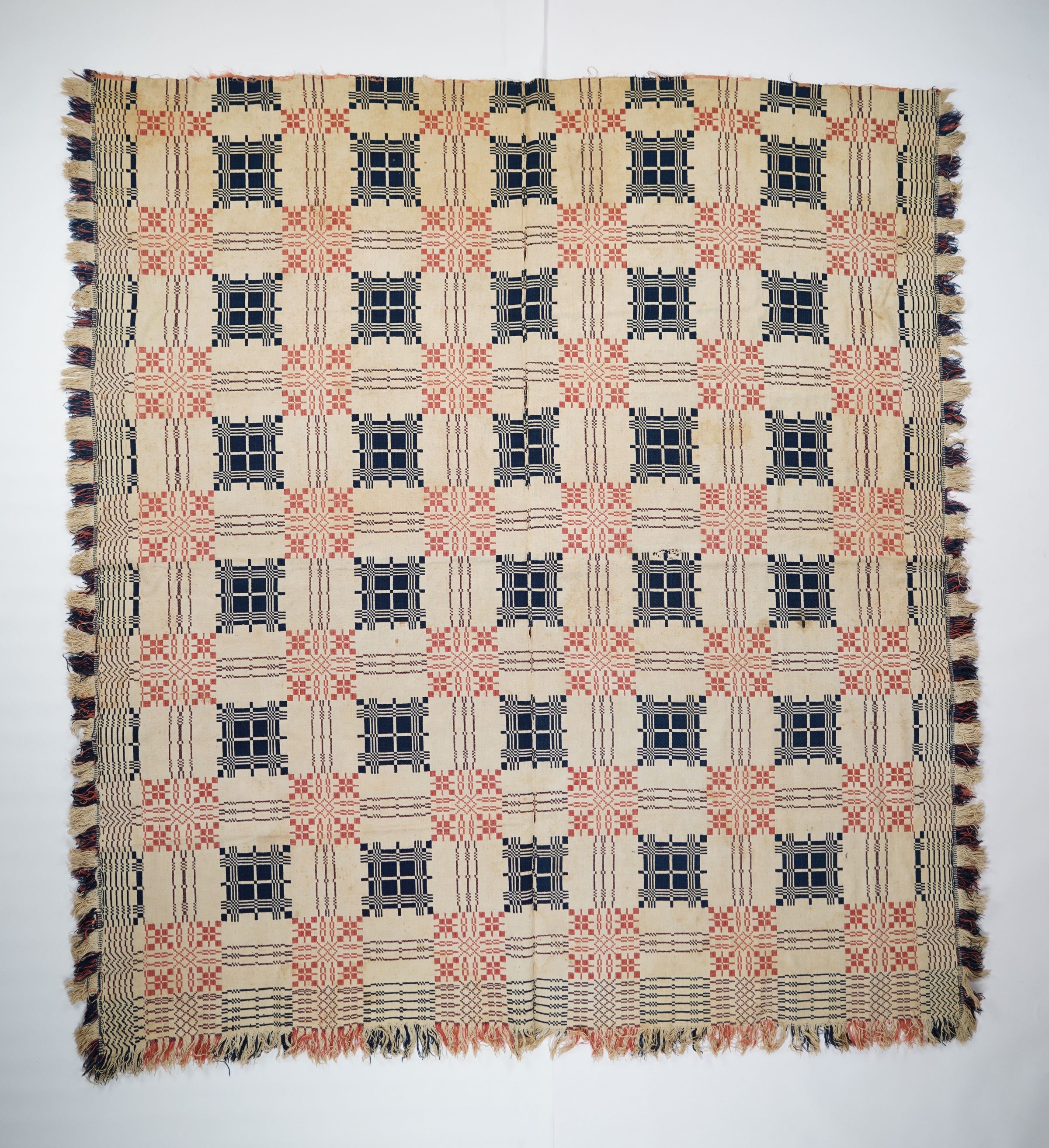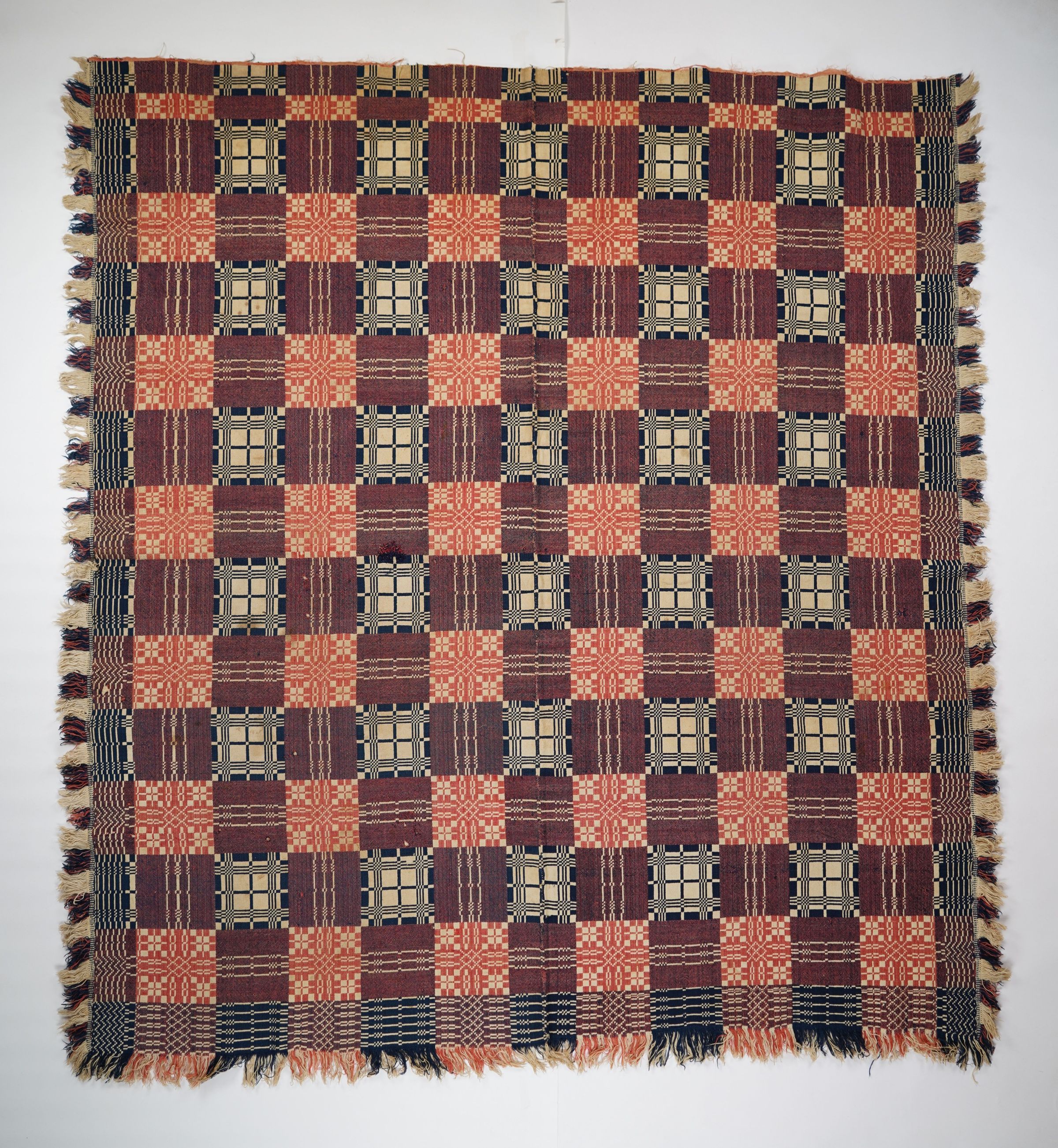 Pink, navy, and natural geometric double weave coverlet with border on three sides, applied fringe along left and right, and self-fringe along bottom. Two joined panels.Collection