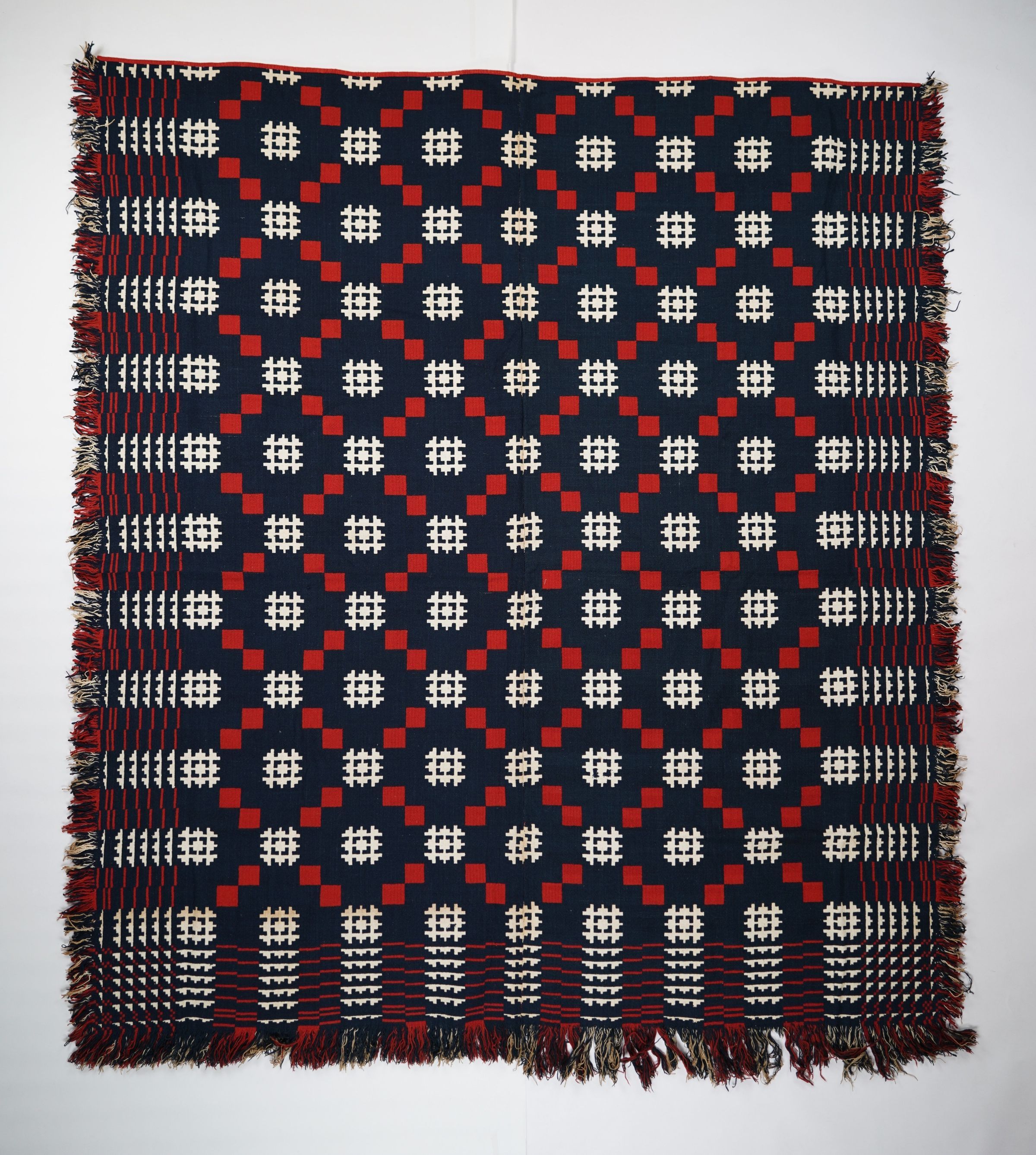 Red, navy, and natural geometric double weave coverlet with border and self-fringe on three sides. Two joined panels.
