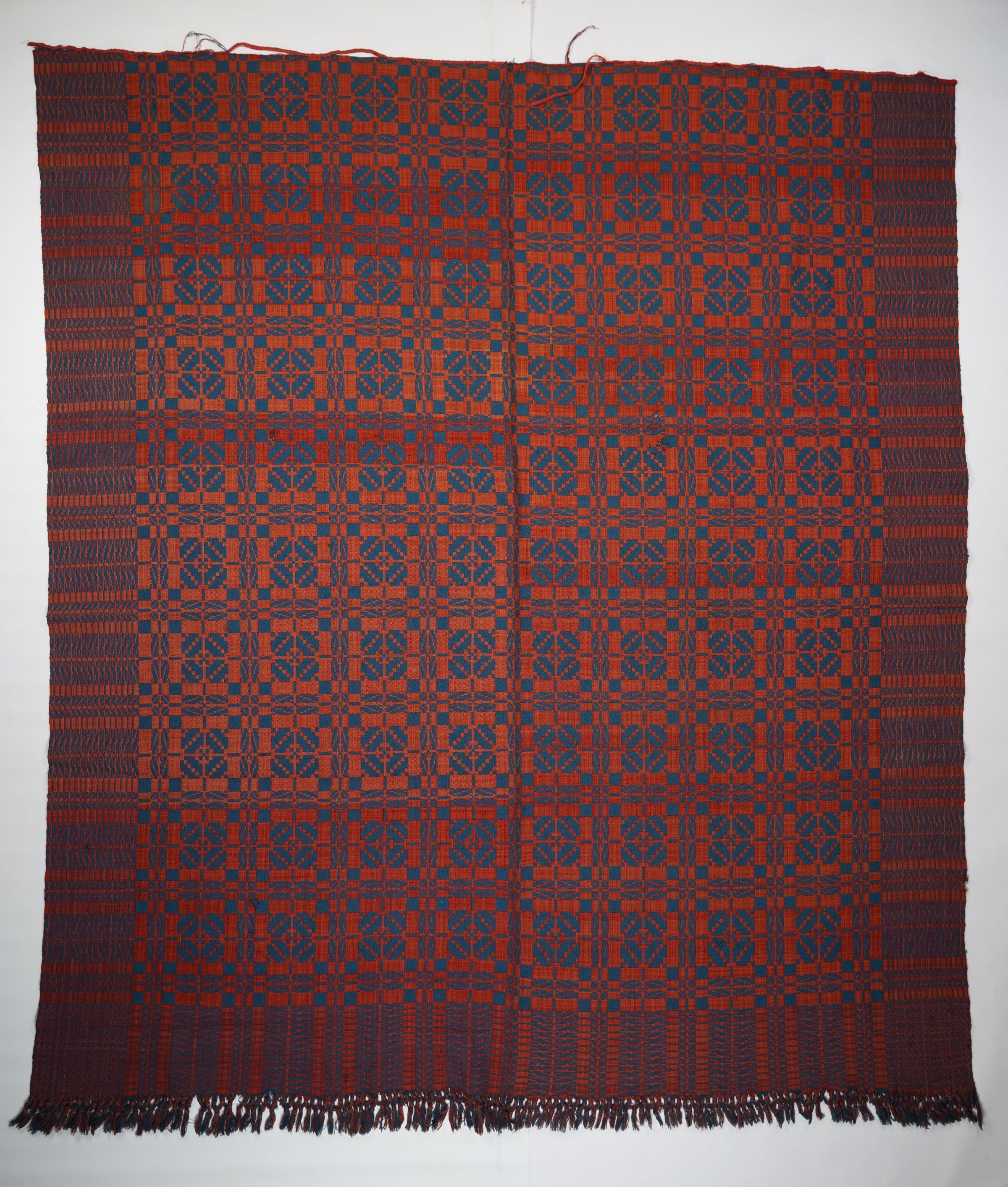 Red and navy geometric double weave coverlet with border on three sides and knotted self-fringe along bottom. Two joined panels.Collection