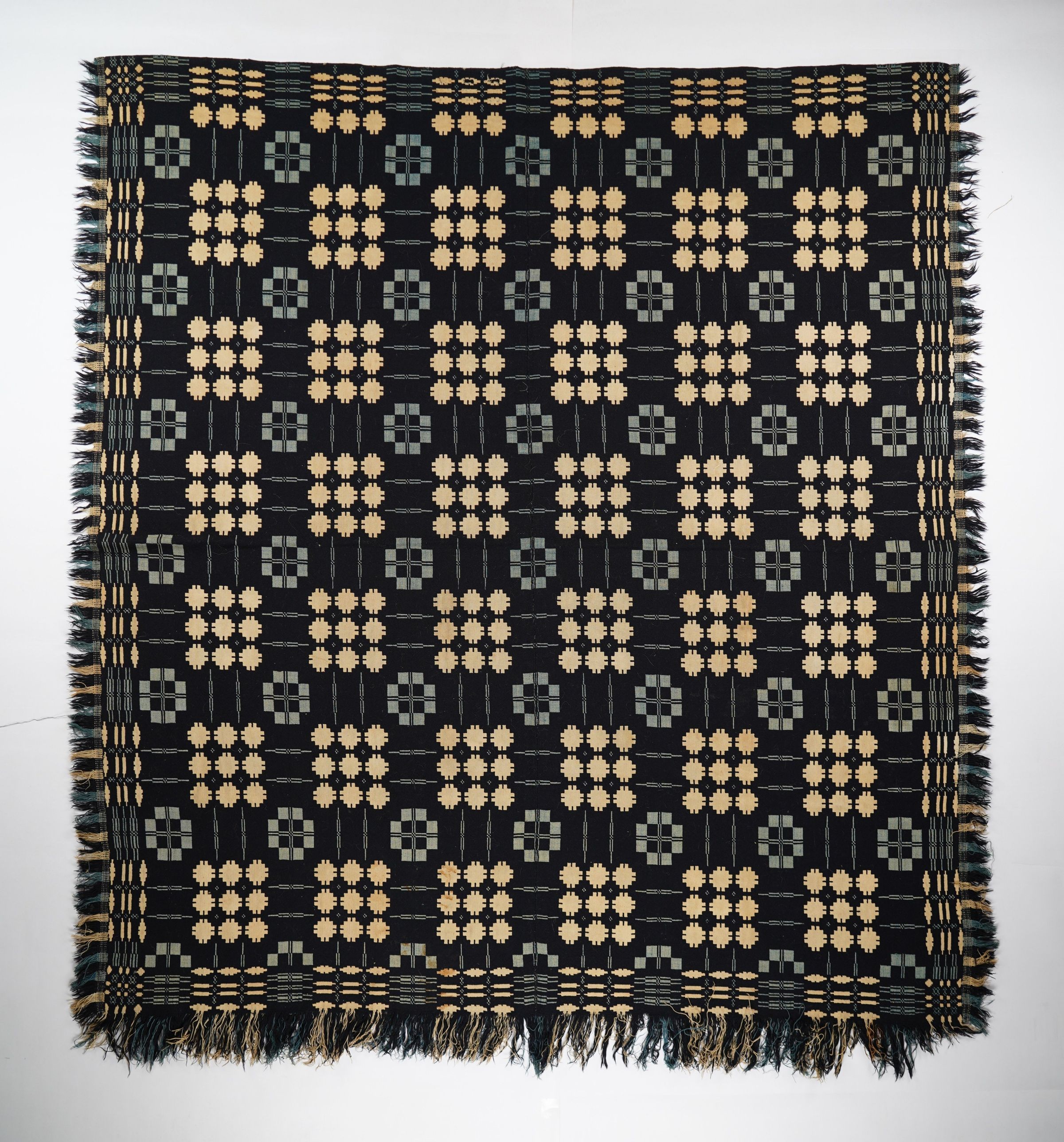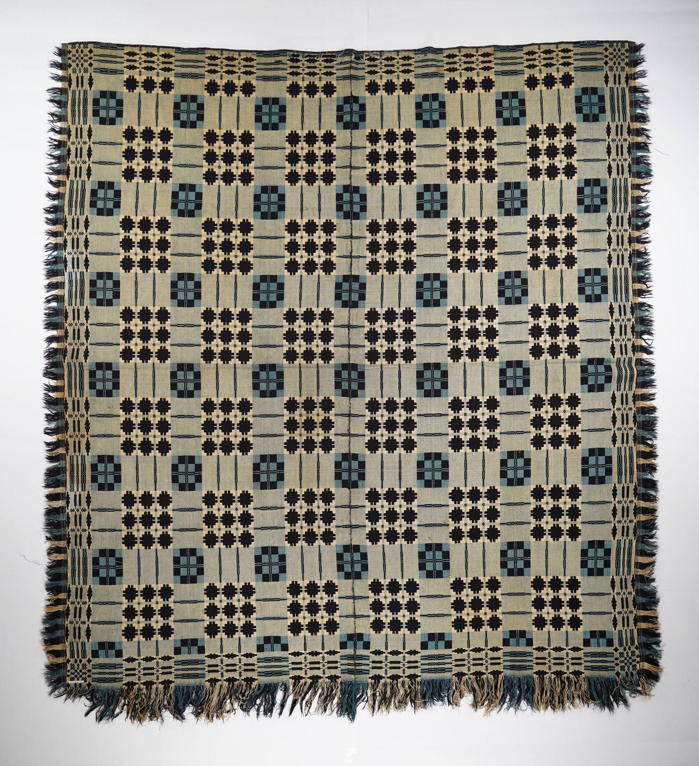 Geometric doubleweave coverlet with borders on four sides and self-fringe on both sides and bottom. Two panels joined by a center seam. Navy and blue wool with undyed cotton. Abstract grid centerfield pattern; abstract border on all sides. Unknown weaver.Context
