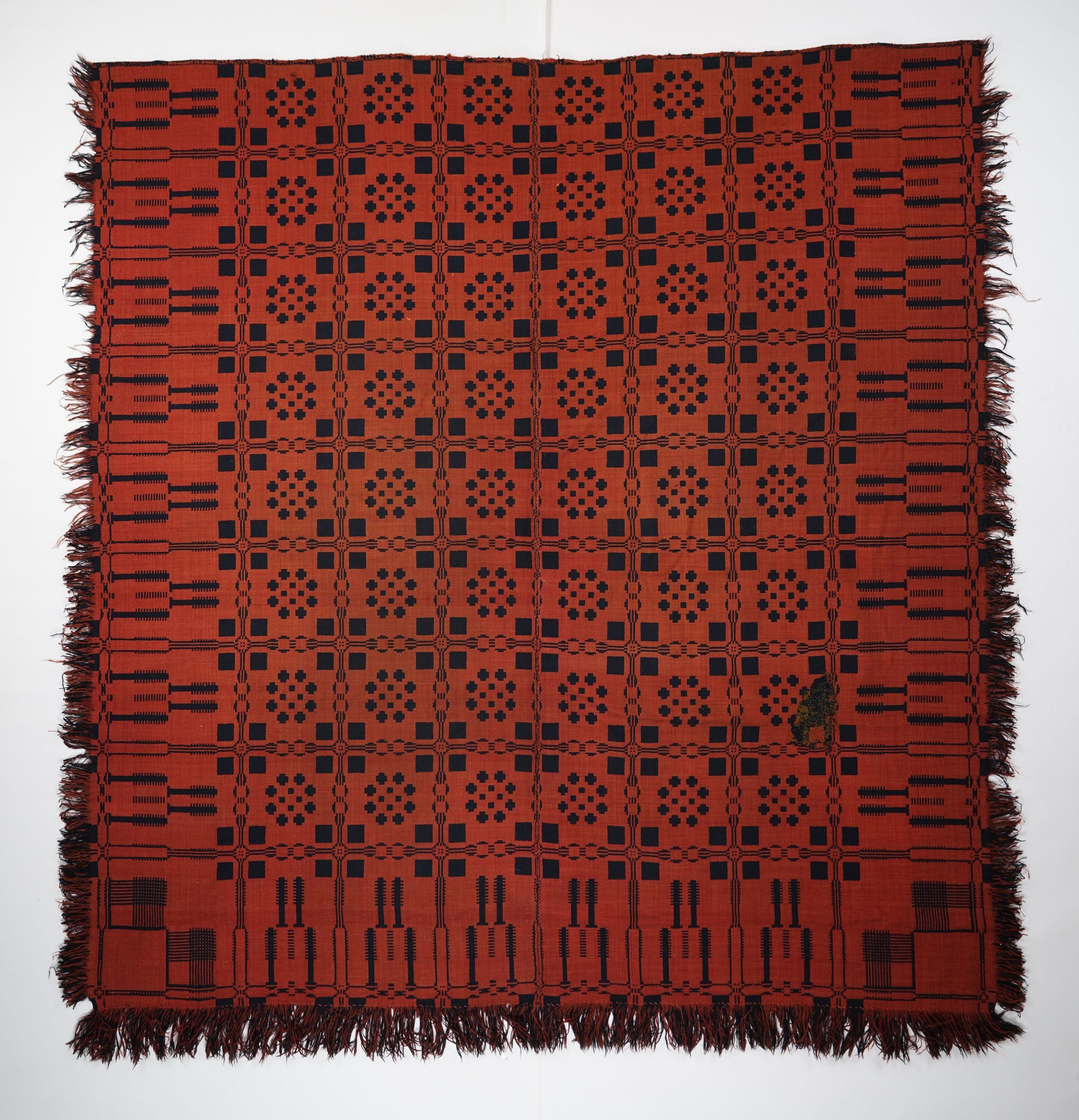 Red and navy geometric double weave coverlet with border and applied fringe on three sides. Two joined panels.