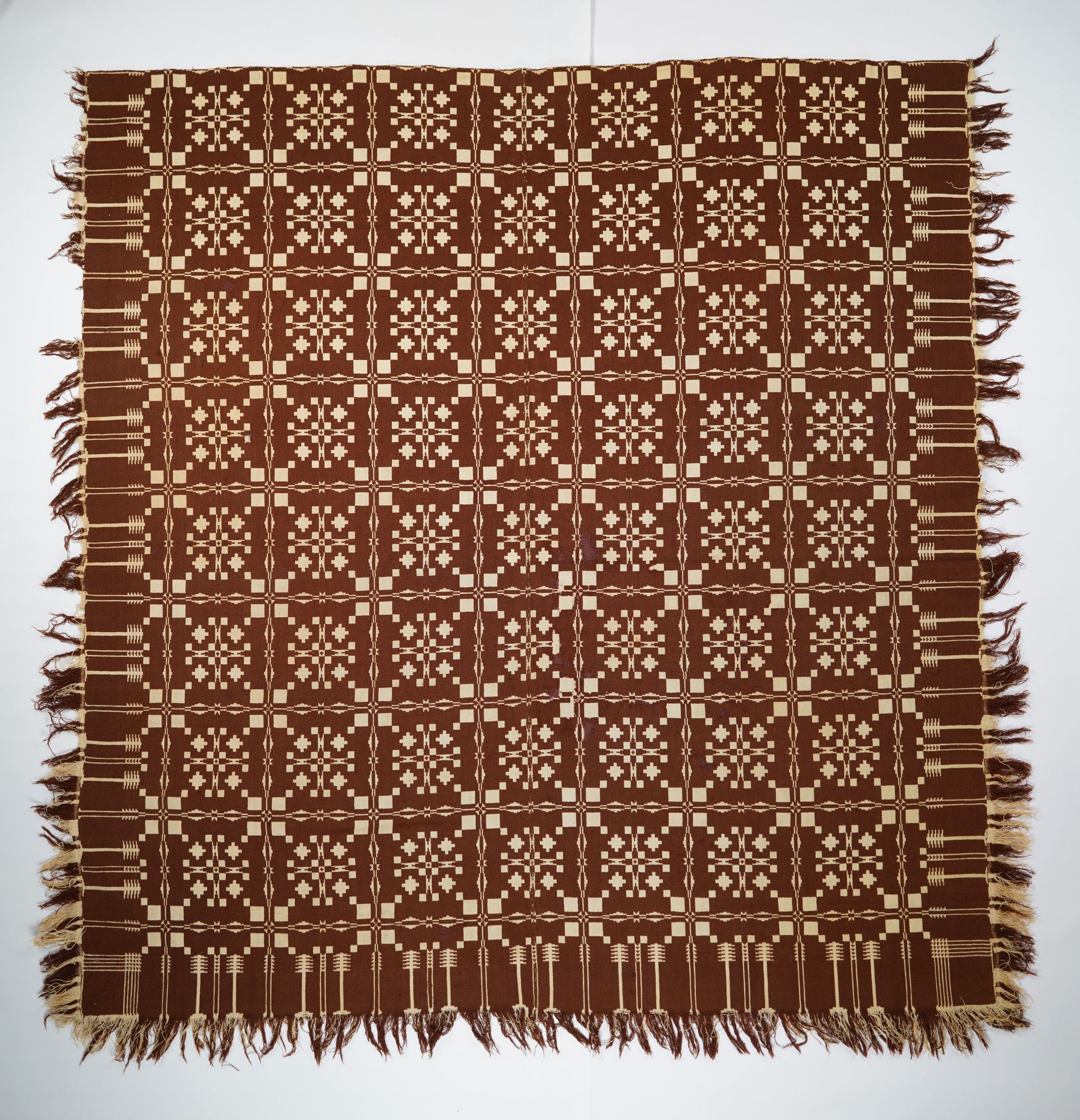 Brown and natural geometric double weave coverlet with self-fringe and border on three sides.