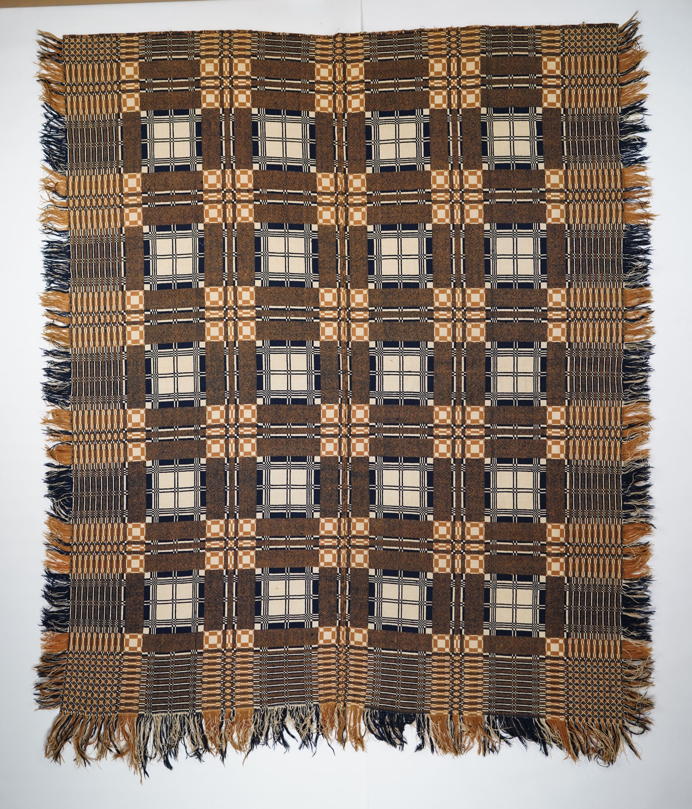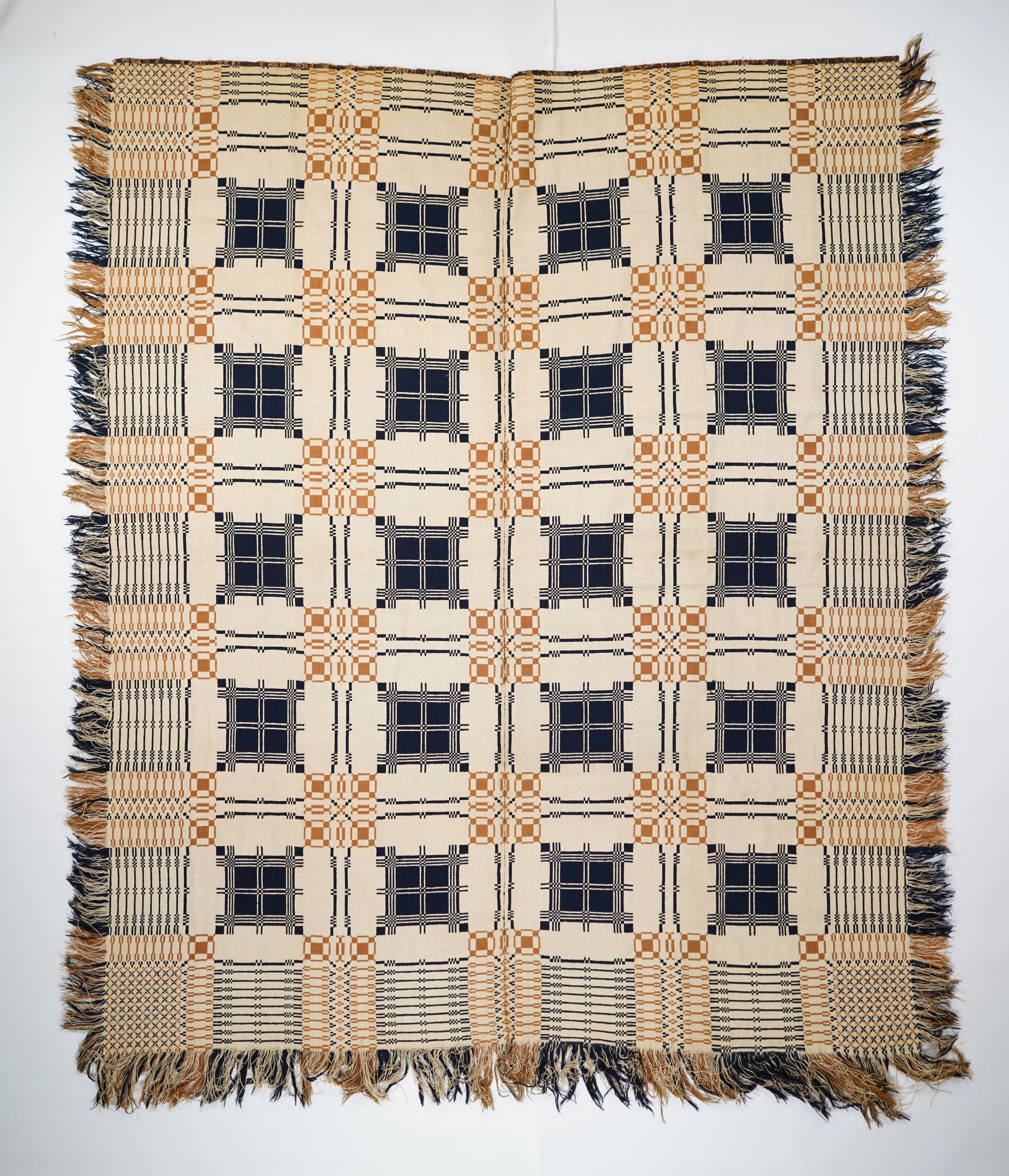 Orange, navy, and natural geometric double weave coverlet with border on four sides and self-fringe on three sides.Collection