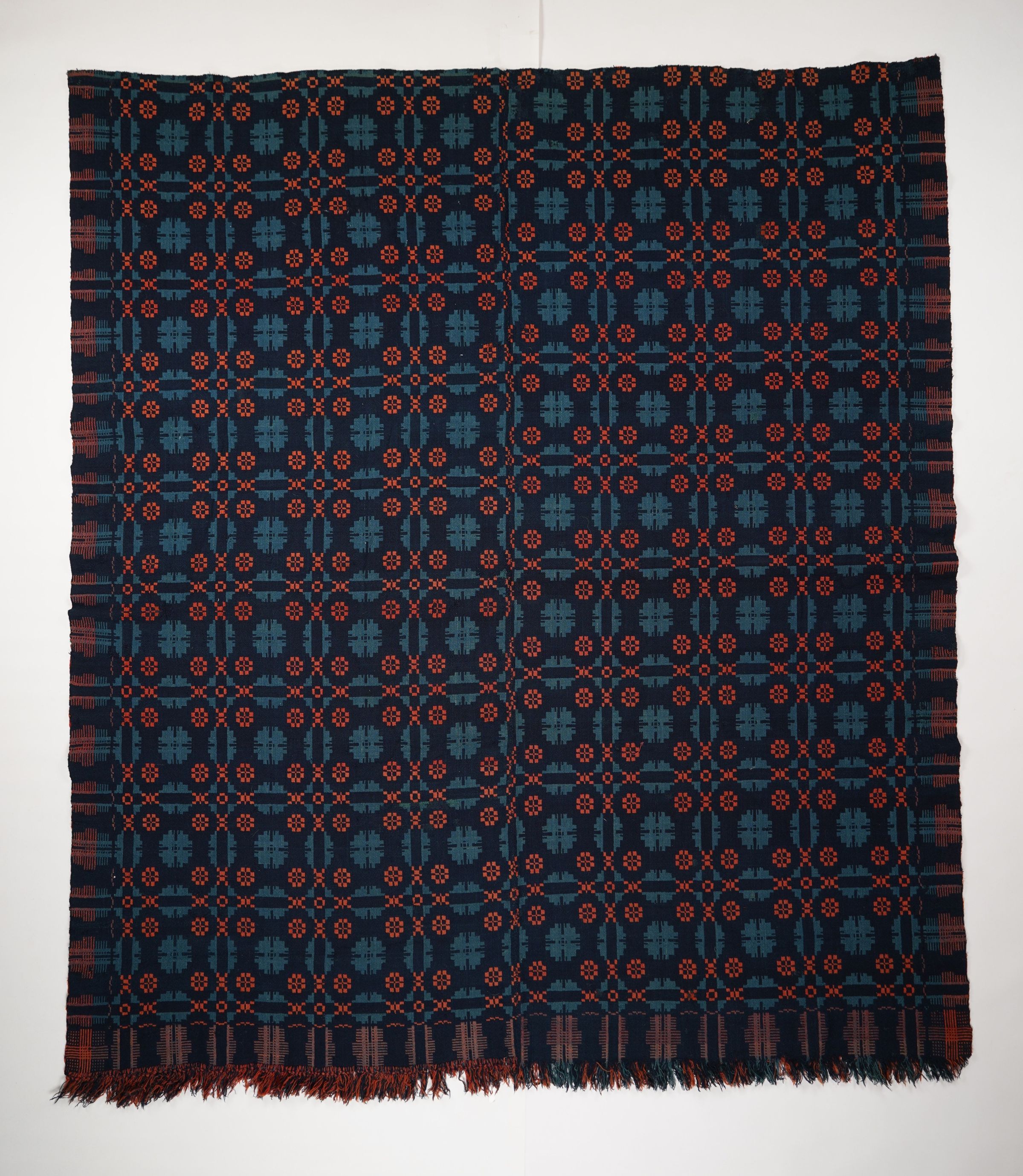 Red, blue, and navy geometric double weave coverlet with border on three sides and self-fringe along bottom. Two joined panels.Collection