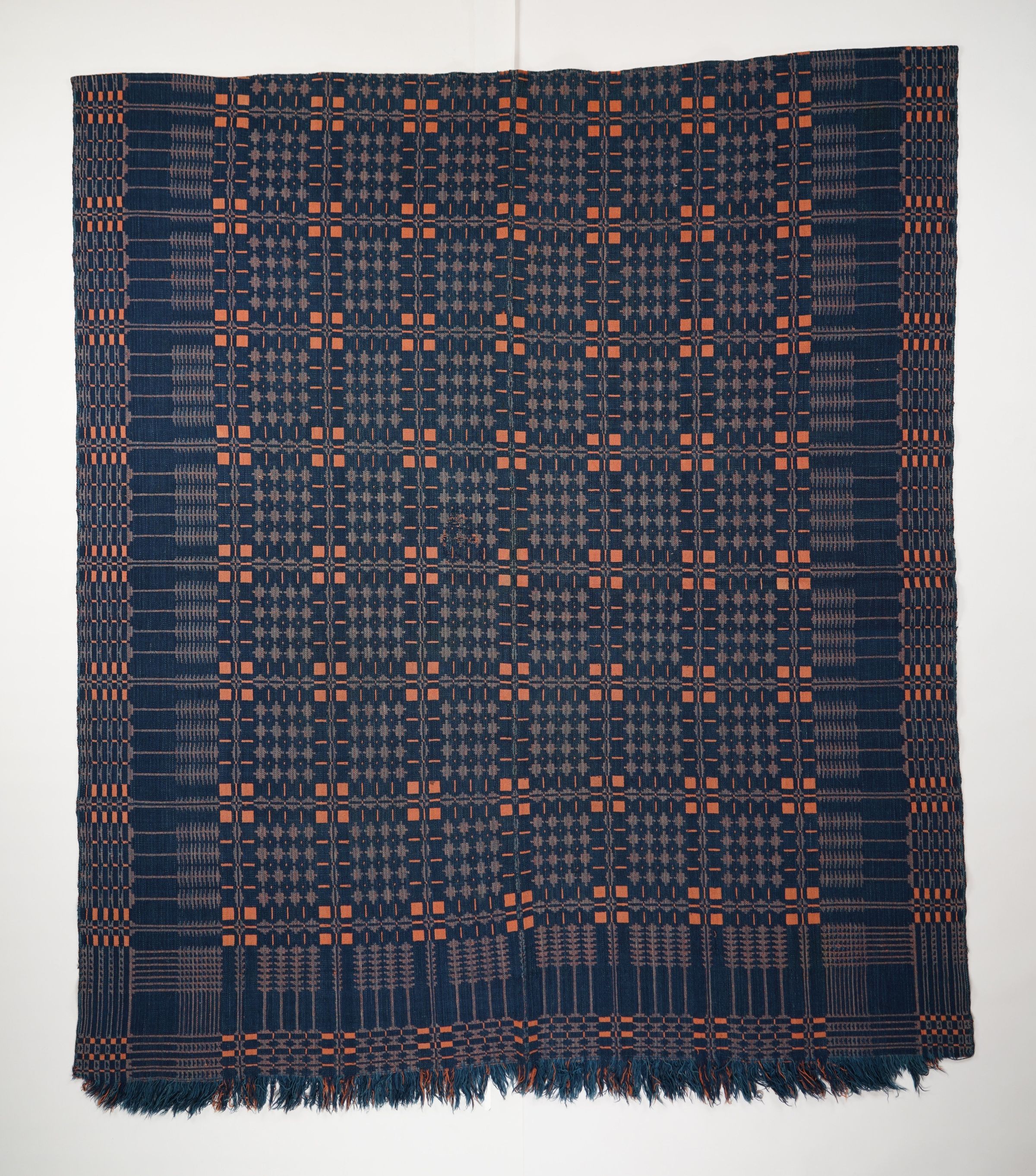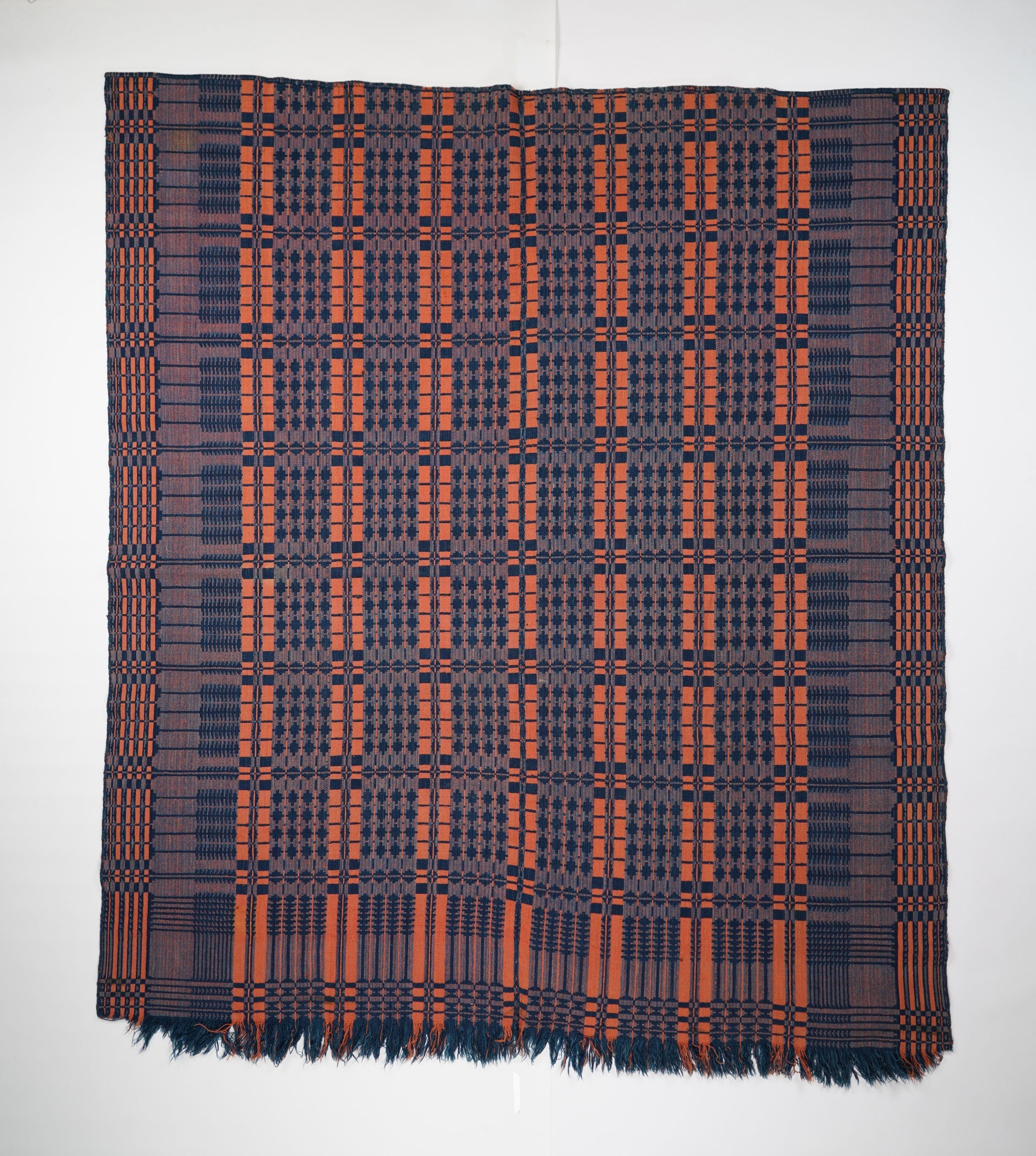 Red, blue, and navy geometric double weave coverlet with border on three sides and self-fringe along bottom. Two joined panels.Collection