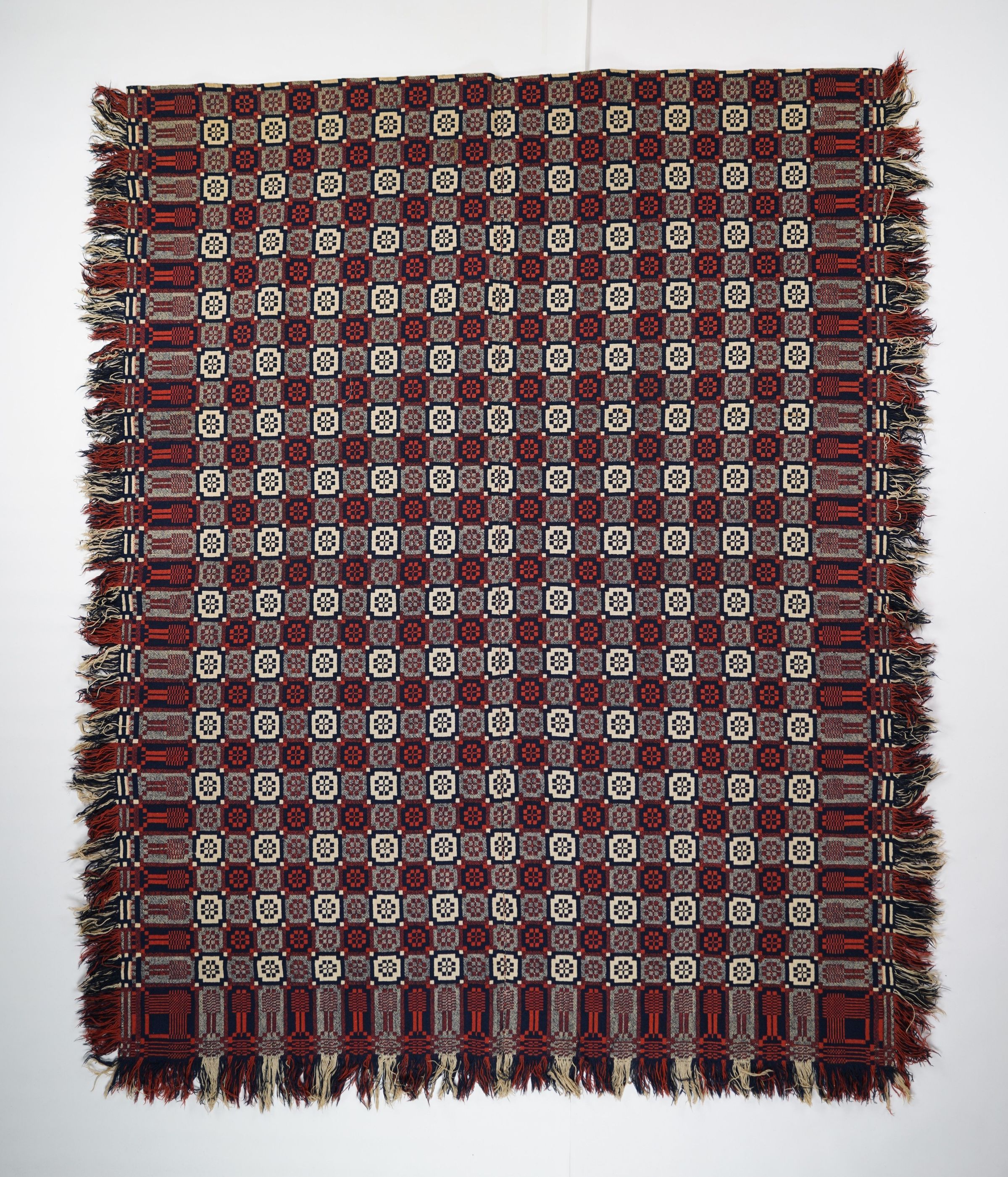 Red, natural, and navy geometric double weave coverlet with border and self-fringe along three sides. Two joined panels.Collection