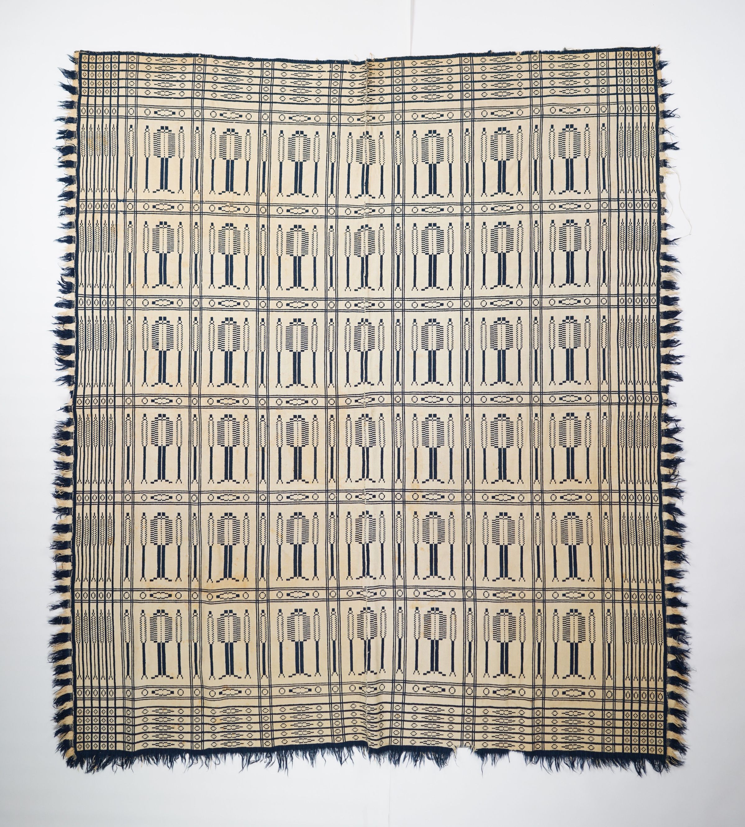 Navy and natural geometric double weave coverlet with border on four sides and applied fringe on three sides.