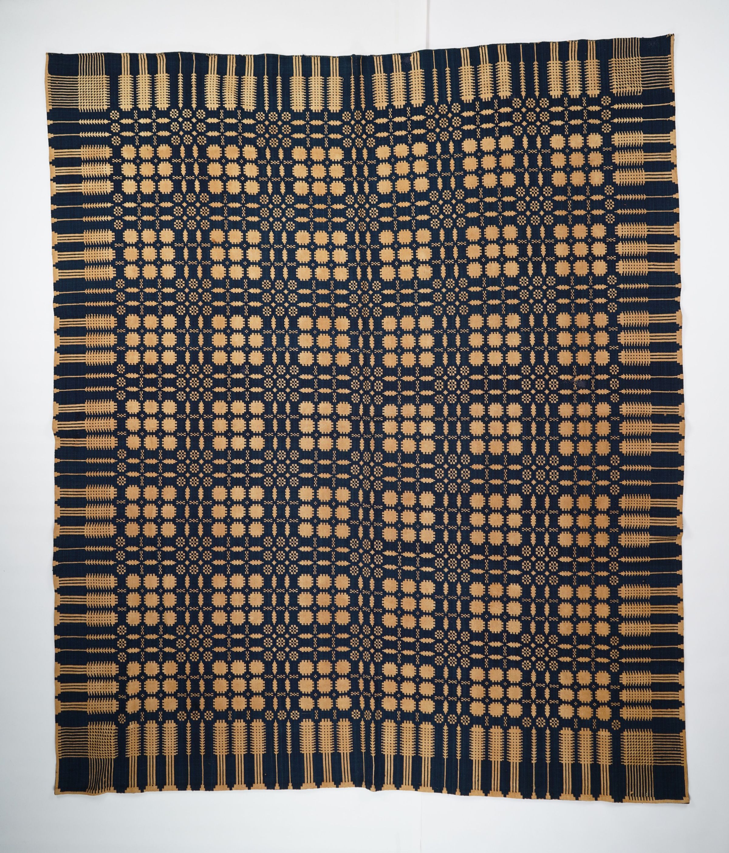 Navy and natural geometric double weave coverlet with border on four sides. Two joined panels.