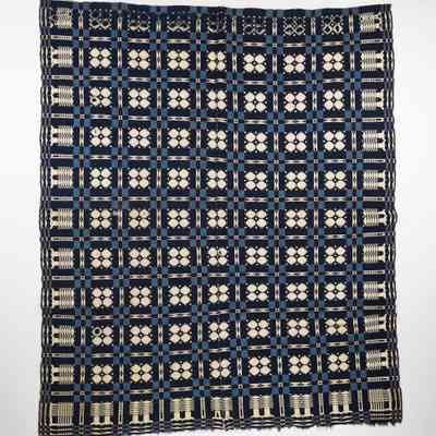 Geometric doubleweave coverlet with borders on 3 sides and self-fringe on bottom. Two panels joined by a center seam. Navy, red, and light blue wool with undyed cotton. Abstract centerfield pattern; pine tree border on sides and bottom. Unknown weaver.Collection