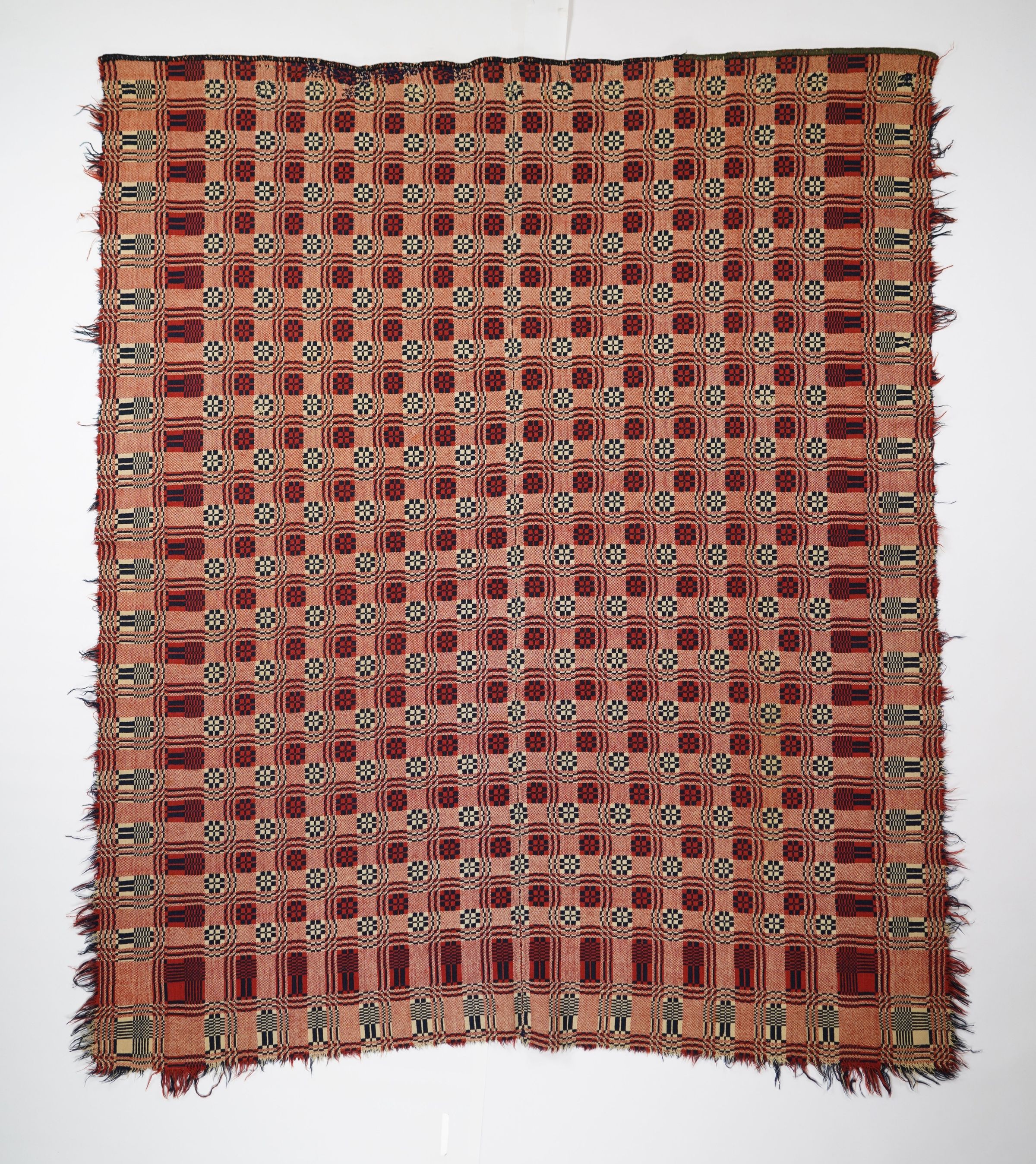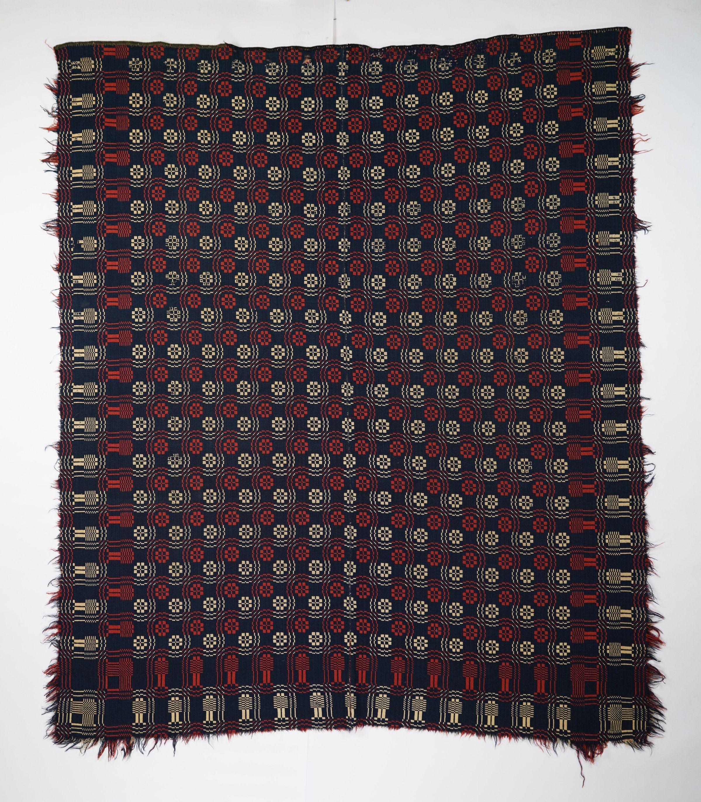 Navy, red, and natural geometric double weave coverlet with border and self-fringe on three sides. Two joined panels.