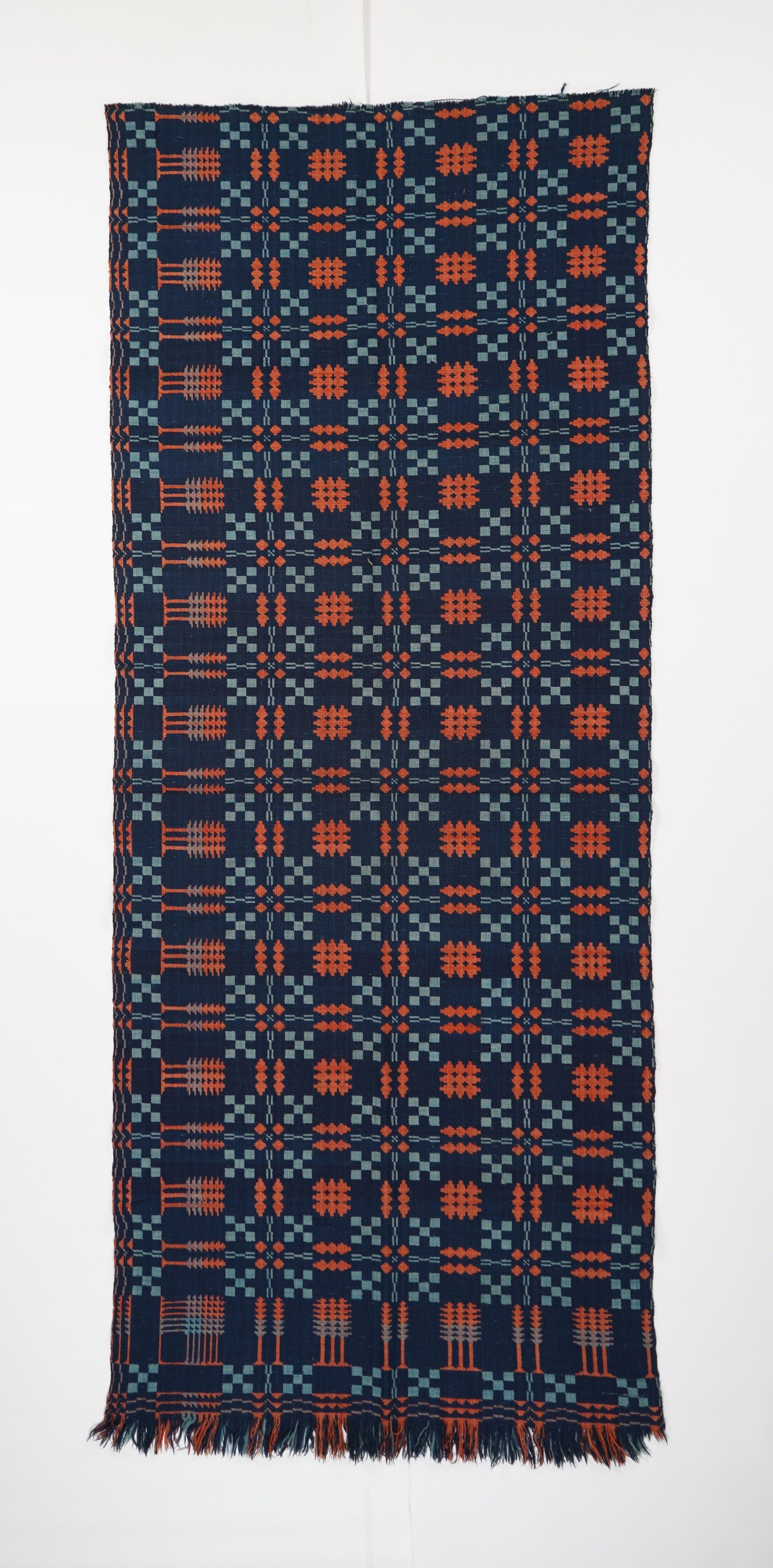 Blue, red, and navy geometric double weave coverlet with border on two sides and self-fringe along bottom. One panel.